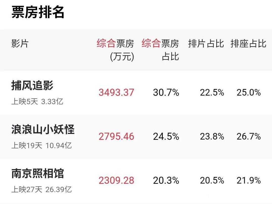 今年的暑期电影档挺有意思,先是《南京照相馆》一枝独秀,连续多日在单日排片和票房占比过半,总票房超过26亿元,一路飙升至内地电影历史票房榜第28位,甚至超过了《封神第一部》,但一部不起眼的2D动画电影《浪浪山小妖怪》悄无声息地异军突起,几天的时间就超越《南京照相馆》占据单日票房第一,总票房也很快超过10亿元,打破了《大鱼海棠》保持了10年的国产2D电影票房纪录,而它的榜首位置还没坐稳,成龙和梁家辉两位大哥的动作犯罪大片《捕风捉影》又一下子热了起来,口碑票房双丰收,上映4天已收获3亿票房,成为新晋单日票房冠军。