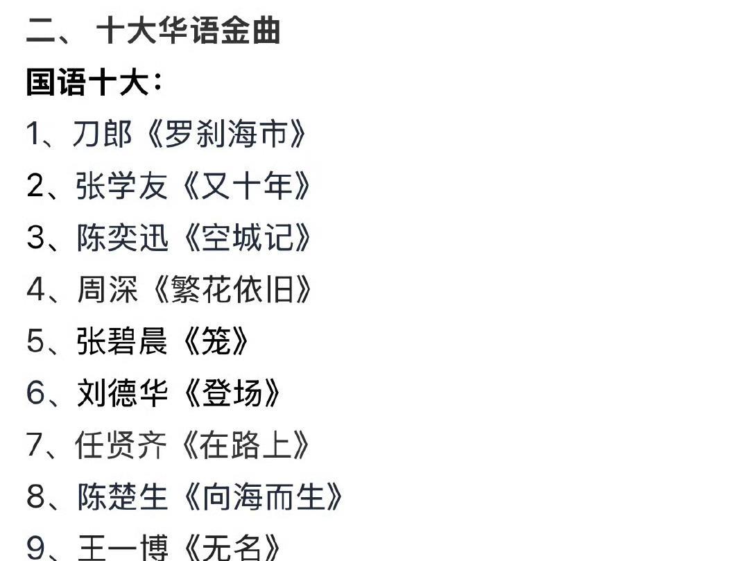 华语格莱美评选的国语十大金曲! 一:刀郎《罗刹海市》 二:张学友《又十年》 三:陈奕迅《空城计》 四:周深《繁花依旧》 五:张碧晨《笼》 六:刘德华《登场》 七:任贤齐《在路上》 八:陈楚生《向海而生》 九:王一博《无名》 十:梁静茹《大人》 有点印象听过的都是OST吧?好几首都是影视歌曲。 这是华语乐坛的格莱美水平?怪不得网友狂喊:乐坛没救了… 十大金曲你听过几首?