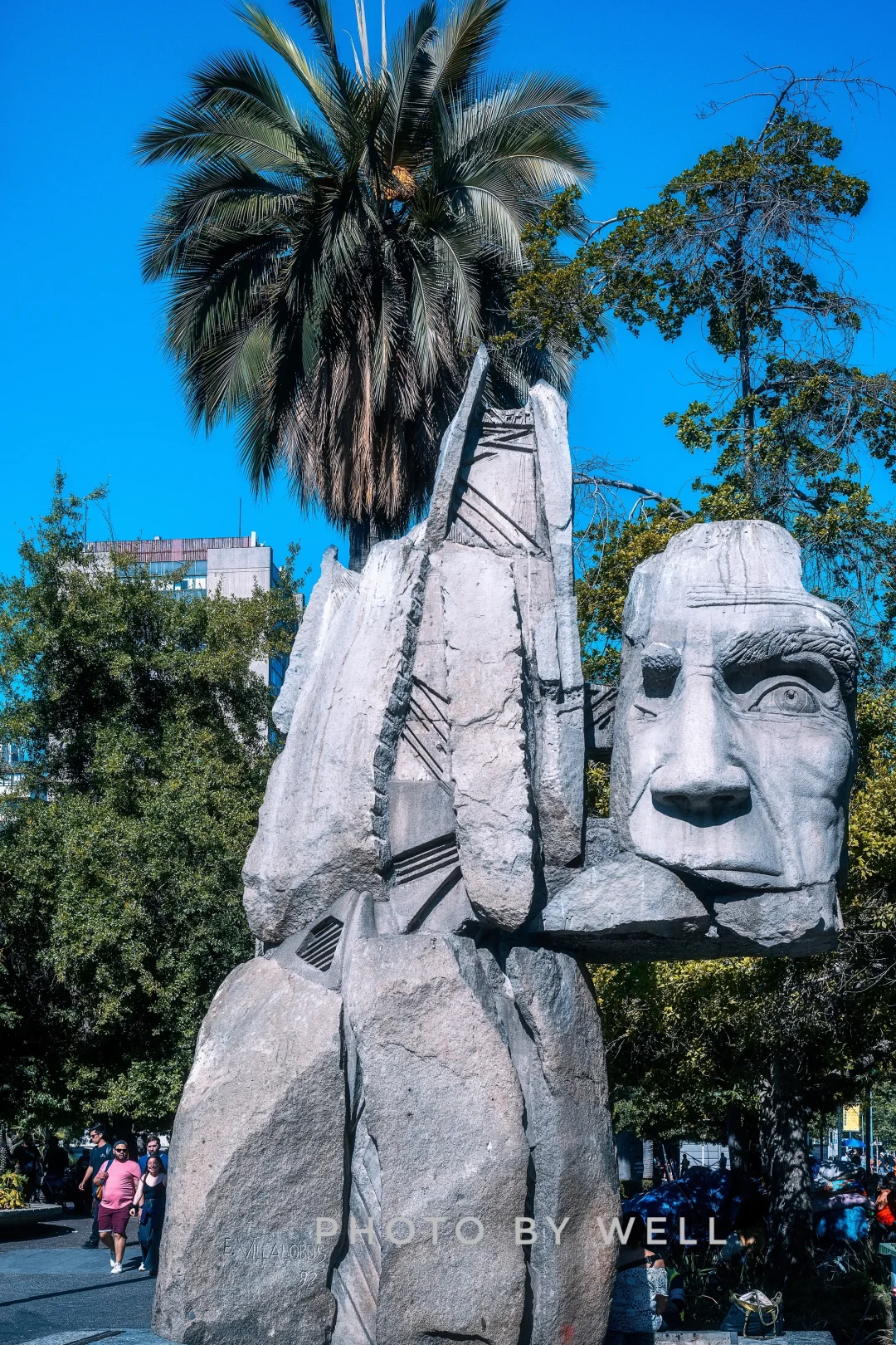 老城的中心是阿玛斯广场(Plaza de Armas),广场是圣地亚哥建城(1541年)的原点,由西班牙征服者佩德罗·德·瓦尔迪维亚亲自规划。它严格遵循西班牙殖民城市的“棋盘式布局”——中心广场四周汇聚宗教、政治与文化核心机构,象征殖民权力的集中。广场的中心现已改造为公园,植满智利棕榈与花草,充满市井活力:民间艺人表演、棋手对弈、市民休憩等。