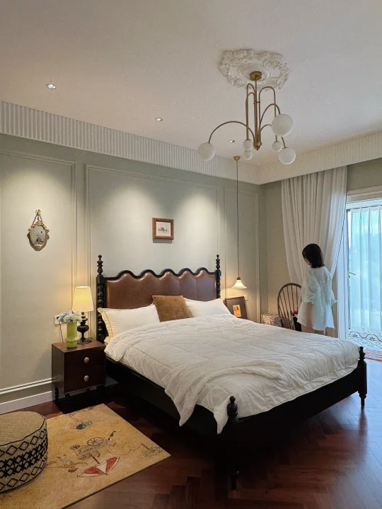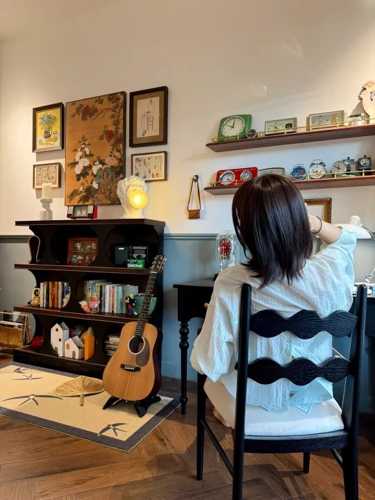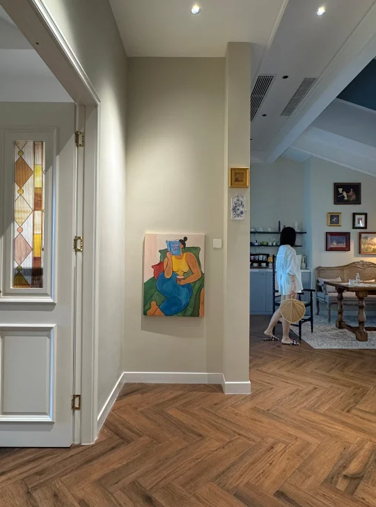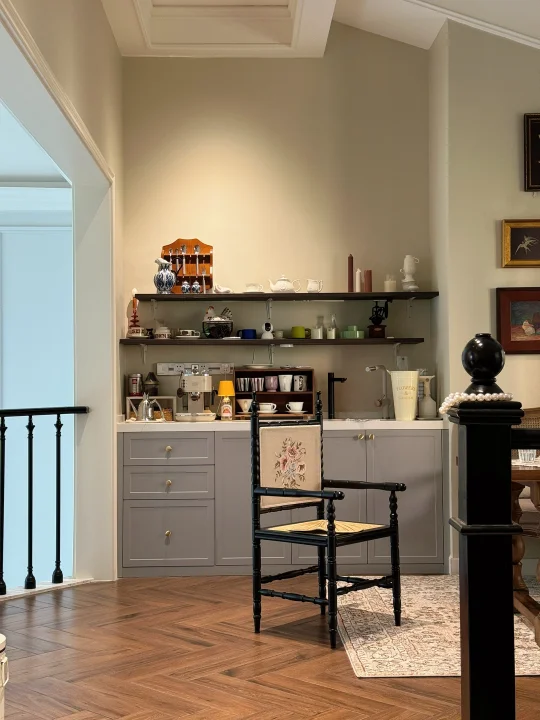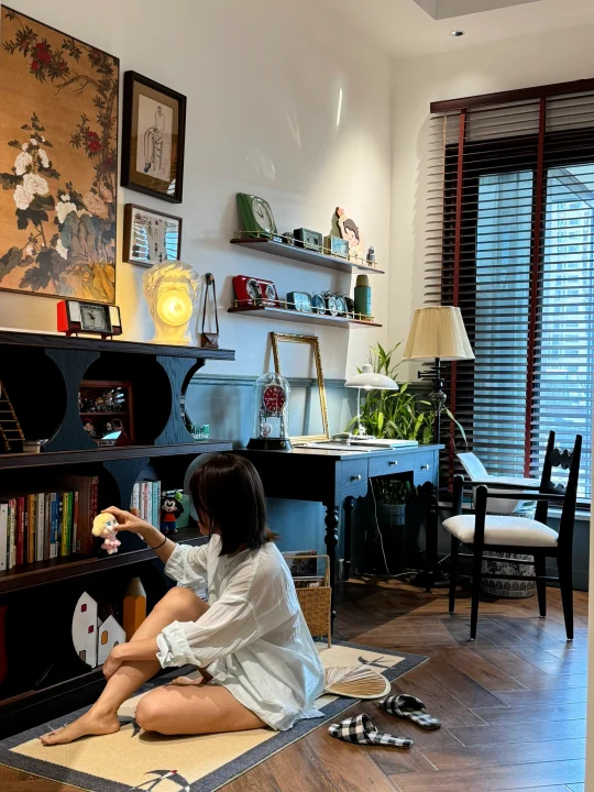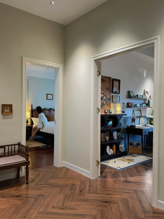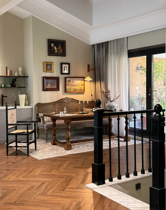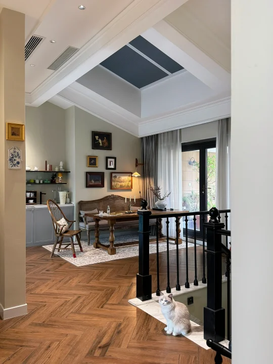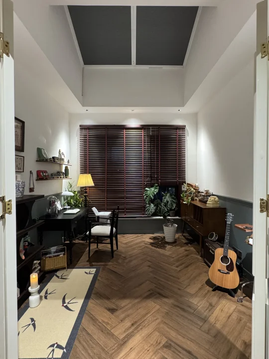 阁楼 🏚️这几年变成了白送的代名词 顶楼复式赠送阁楼 很多人都会觉得不实用 因为送的那半层 大多层高低面积小的缺点 所以选房时要选这种顶楼跃层 (暨一套住宅占用了两个标准层高且室内用楼梯衔接) 我家就是这种很典型的7跃8层 因为楼顶都是不规则尖尖顶 所以二楼比一楼还高(最高处4.5米) 送的两间将近50平的阁楼阳光房 一间做书房一间做会客厅 顶楼阳光光照充足 可以放心大胆的用深色系家具 人字拼木纹砖地面➕胡桃木家具 不赶时髦的装修 可以看很久都不会腻.