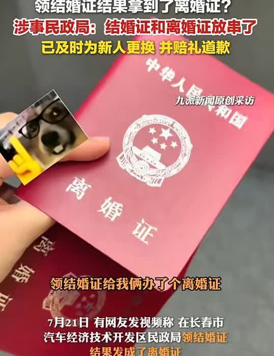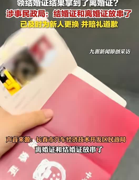 “一开局就是二婚!”吉林长春,女子和男朋友满怀期待的来到民政局办理结婚证,不料因工作人员的拿错本给两人办成了离婚证,工作人员发现失误后及时为两人更换了新证,并进行了赔礼道歉。网友:没结婚就先离婚是方便,直接跳过冷静期。 2025年7月21日,在吉林长春,有一对情侣高高兴兴地去民政局登记结婚。他们恋爱了好久,终于打算在这一天成为正式的夫妻。两个人特意打扮了一番,满心期待地走进民政局,就等着拿结婚证呢。 可谁想到,当红色的小本本递到他们手里时,女方一眼就看出了问题——封面上竟然写着“离婚证”。他们俩一下子就愣住了,赶紧找工作人员问清楚。原来啊,是工作人员不小心把新到的离婚证和结婚证给弄混了,这才闹出了这么个误会。 工作人员一看弄错了,赶紧道歉,并且很快就给他们换上了真正的结婚证。虽然中间出了点小插曲,但最后这对情侣还是顺顺利利地拿到了属于他们的结婚证。这事儿在网上一传开,大家立马就炸了锅。有网友开玩笑说:“还没结婚就先离婚,冷静期都省了。”还有的网友讲:“以前离婚证是绿色的,现在换成红色了,看来离婚也成喜事儿了。”当然,也有人心里不太舒服,“我结婚那天,前面还有人排队离婚呢,后来我也离了,虽说不是因为这个,但总感觉有点别扭。” 这对新人“一开场就离婚”的误会虽然解决了,但也给他们留下了挺特别的回忆。希望他们以后的日子过得甜甜蜜蜜,别被这点小风波给影响了。
