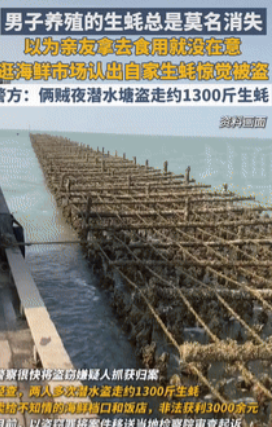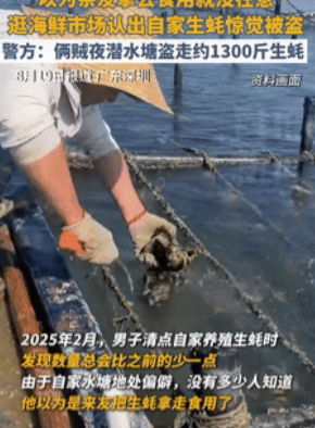 心不是一般的大!广东深圳,一男子养殖的生蚝总是莫名消失,他以为是亲友拿走吃了,就没太在意,不料,在一次逛海鲜市场时,竟发现了自家特有品种的生蚝,这才发觉消失的生蚝,其实是被偷了! 据封面新闻8月21日的报道,事情还要从半年前说起,男子清点自家水塘里的生蚝时,发现数量有些对不上,但只少了一点点。 因为水塘的位置比较偏僻,他就觉得应该是家人过来,拿了一点回去吃了,所以就没有太将其给当回事,即便是后面还发现了这种情况。 直到有次他去家附近的海鲜市场闲逛时,意外看到有人正在售卖,自家所养殖的特有品种的生蚝。 可这个时候明明还不到上市的时间,并且自己也没向外售卖,那么对方的生蚝是哪里来的呢? 就这样,他才醒悟过来“消失的生蚝”,到底是怎么回事,原来是被小偷给光顾了,亏得自己还以为是家人拿的。 随后他急忙去报了警,在经过调查之后,民警就成功抓获两个人,据他们所说,是因看到男子不经常过来打理水塘,觉得偷走一些应该不会被发现,所以在晚上的时候,就带着工具“进货”去了,总共是偷了有1千3百多斤,卖了有3千多。 别的先不说,男子的心是挺大的,丢那么多的东西,丝毫没往被偷上想,还以为是亲戚,但凡问下亲戚就能知道,非得给小偷机会。 那么对于这件事情,您有什么想说的呢?