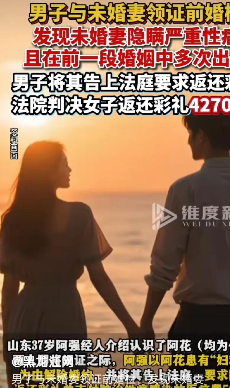 山东,男子跟未婚妻去做婚检,医生把他叫到一边,悄悄说,你未婚妻不适合结婚,男子大惊,回去后偷偷调查未婚妻,发现她竟有不可告人的秘密,未婚妻不仅有性 病,而且她半年前之所以跟前夫离 婚是因为她常常出去偷人。男子气愤不已,要求未婚妻退还66000彩礼,2000元倒酒钱,另外还要赔偿他防治性 病感染的费用5000元。结局亮了。 8月20日,黑龙江网报道,山东一男子,跟未婚妻去做婚前检查后,才发现,原来他的未婚妻不简单,男子为此头疼不已。 阿强(化名)是山东人,37岁了一直没有对象,家里父母着急,他自己也忧心。 像他这个年纪,结婚早的,人家孩子都上初中了,可他连女朋友影都没见。 他做梦都希望自己尽快找到自己的另一半,两人踏踏实实把日子过好,可他的媳妇在哪里? 为了尽快实现早日脱单,阿强和家人到处托人帮他物色对象。 2024年8月份的一天,阿强经人介绍认识阿花(化名),虽然阿花离过婚,但是她样貌不错,人看着也温柔,阿强很满意。 阿花也不嫌弃阿强,他说只要两个人真心在一起,日子总会过好。 两人聊了一段时间,很快确定恋爱关系,阿强已经37岁,眼看着快40了,他可不想错过阿花这么好的女人。 2024年9月份,阿强和阿花举行了隆重的订婚仪式,阿强亲手把66000元彩礼递到阿花手上。 他认定,阿花就是他这辈子要娶的女人。 订婚那天,阿强家人还给了阿花2000元的倒酒钱,他们很珍惜这个迟来的儿媳妇,希望小两口和和美美幸福度过一生。 可人算不如天算,阿强在和阿花领结婚证前按惯例去做了婚前检查。 检查结果阿强一切正常,身体很健康,可当他问到阿花的情况时,医生却支支吾吾,欲言又止,阿强觉得很奇怪。 最后,医生把阿强叫到一边,小声跟他说道,你的未婚妻不适合结婚。 阿强听完,瞬间懵了,自己不是傻子,医生这么说,说明阿花的身体出了问题。 之后,阿强经过调查,竟发现了阿花惊人的秘密。 原来阿花不仅有很难治愈的性 病,更过分的是,她半年前之所以跟前夫离 婚,是因为她常常跑出去偷 人。 知道这一切的阿强心里既气愤,又委屈,他怎么也没想到阿花是这样的人,这不仅仅是骗钱骗彩礼。 更是欺骗他的感情,自己满心期待,满心欢喜,以为遇到共度一生的良人,没想到结局会这样。 最终,阿强把阿花告上法庭,他提出解除婚姻,要求阿花退还全部彩礼66000元,与其订婚当天家人给她的2000元倒酒钱,另外还要支付5000元防治性 病感染费用。 有人说,这就是结婚之前做婚检的好处,建议每对情侣结婚之前都要做婚检。 其实,阿强也不必太过伤心,还没领证就知道这一切,及时止损好过跟她结婚染病了才知道强。 那么,从法律角度如何看待这个事呢? 《最高人民法院关于适用〈中华人民共和国民法典〉婚姻家庭编的解释(一)》第5条规定,当事人请求返还按照习俗给付的彩礼的,如果查明属于以下情形,人民法院应当予以支持: 双方未办理结婚登记手续; 双方办理结婚登记手续但确未共同生活; 婚前给付并导致给付人生活困难等 在本案中,阿强和阿花只是订婚,还未办理结婚登记手续。根据上述法律规定的第一种情形,阿强要求阿花退还彩礼66000元,于法有据。 因为彩礼的给付通常是以缔结婚姻为目的,既然双方最终未能结婚,那么彩礼理应返还。 订婚时,阿强家人给阿花的2000元倒酒钱,从性质上判断,如果当地习俗中这属于彩礼范畴的一部分,那么也应当一并返还;如果能证明这是单纯的赠与行为,且没有附加任何条件,那么阿强要求返还可能难以得到支持。 不过,若结合整体的婚嫁习俗和目的,在未结婚的情况下,将其认定为彩礼的一部分,要求返还具有一定合理性。 2、阿强要求阿花支付防治性 病感染费用是否合理? 《民法典》第1165条规定,行为人因过错侵害他人民事权益造成损害的,应当承担侵权责任。 依照法律规定推定行为人有过错,其不能证明自己没有过错的,应当承担侵权责任。 阿花明知自己患有性病,却在与阿强交往和订婚过程中隐瞒这一事实,这种行为存在过错。 阿强有理由担心自己被感染,主张5千元防治性病感染费用,从侵权责任角度来看,阿花的隐瞒行为可能构成对阿强健康权的潜在威胁。 如果阿强能够证明其主张的防治费用具有合理性和必要性,比如提供医生建议、相关预防措施的费用凭证等,那么法院有可能支持阿强的这一诉求 ,判决阿花承担相应费用。 阿强给阿花的彩礼6万6及倒酒钱2千,共计6千8,有相关证据证明,且阿花曾返还给阿强7千元。 法院综合考虑双方恋爱时间长短、彩礼数额、共同生活情况及当地习俗等因素,作出判决,阿花返还阿强彩礼款42700元。 真是婚前不擦亮眼睛,婚后难保不闹心,还好婚检及时止损了! 对此大家怎么看呢? 欢迎关注@猫眼学法 学习更多法律知识