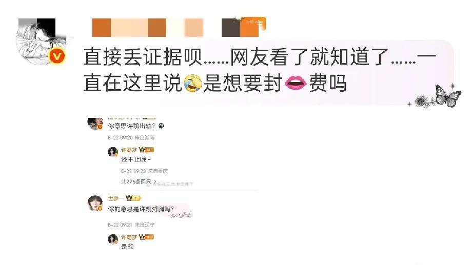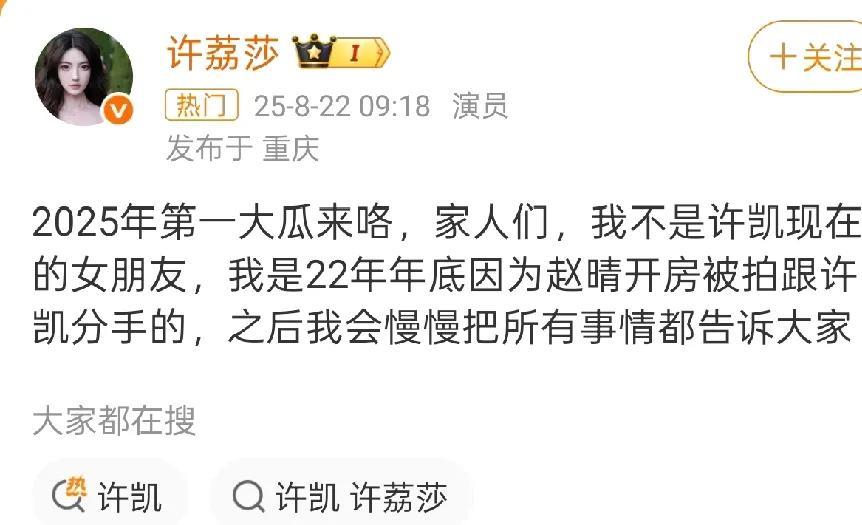 8月22日,一大早娱乐圈就曝出一则大瓜,还不是狗仔曝的,而是明星本人曝的,女明星许荔莎爆料自己和许凯恋爱过,还因为许凯和赵晴开房分手了,自己手里有很多许凯的瓜。 果然真正的大瓜根本就轮不到狗仔曝,看明星本人曝出来可精彩太多了,特别是许荔莎话里有话,内涵许凯不仅感情上不专一有问题,还有其他的问题,全都说出来,许凯的事业也就毁了。 不过也有很多网友觉得许荔莎现在出来爆料是想要封口费,毕竟她在娱乐圈就是一个小透明的存在,和许凯2022年就分手了,现在都过去3年了,出来爆料不是要钱是什么? 大家怎么看这件事呢?