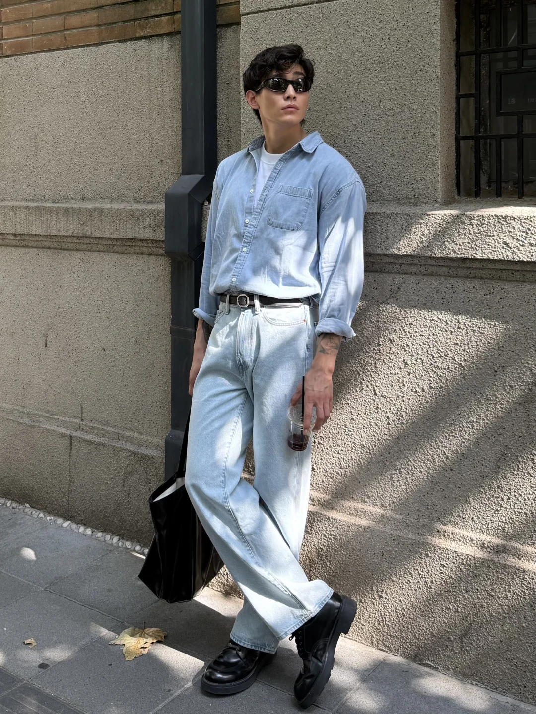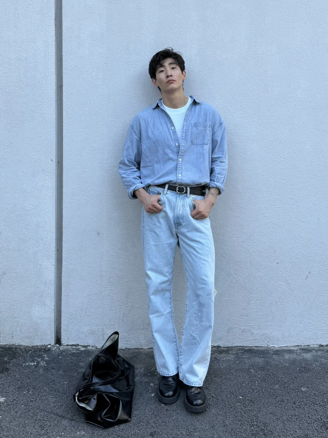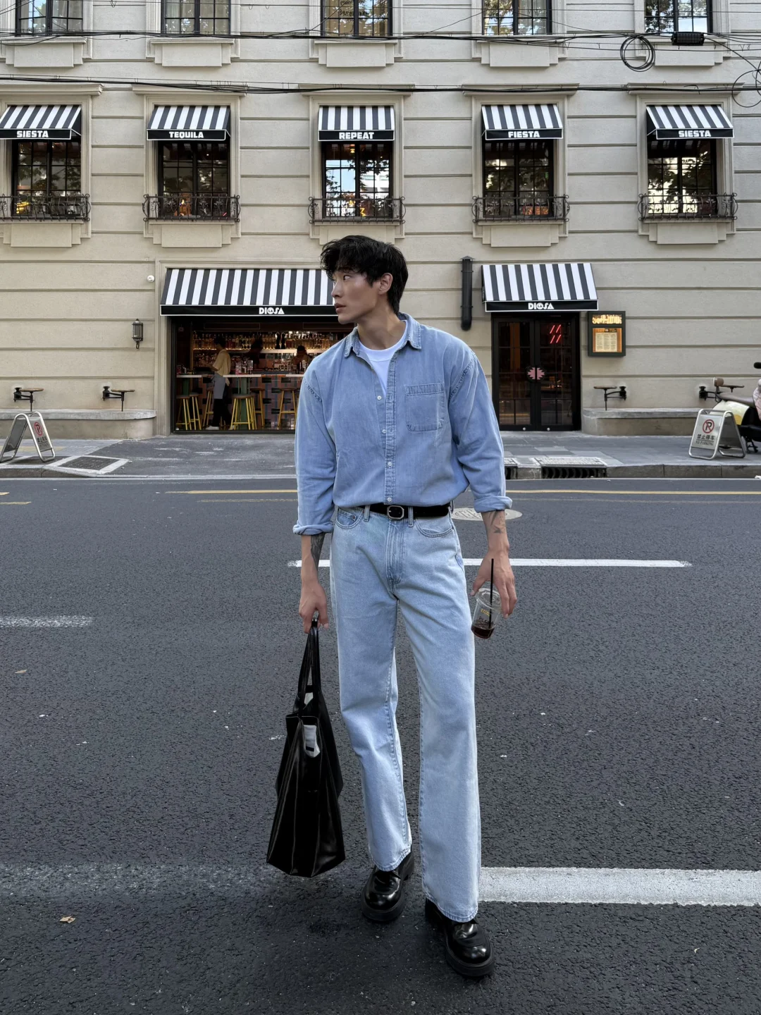 换上经典丹宁衬衫与水洗牛仔裤叠穿白色T或轻柔早秋卫衣