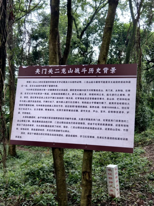 来源1935年红四方面军在此进行了夹门关战役,他们在二龙山上修筑了防御战壕和临时指挥所,与敌军进行了艰苦奋战。现山上还遗留有战场遗迹。