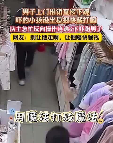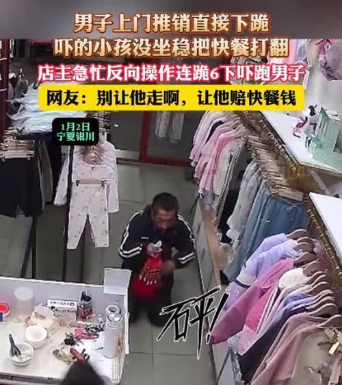 宁夏银川,女子和孩子正在店里吃饭,突然一位男子从门外进来,二话不说直接当着她们跪下了连磕3个头,然后拿出自己的产品开始推销,孩子被眼前的男子给吓着了,本来要坐椅子上没也坐稳,带着饭盒一起摔到了地上。 在宁夏银川的一个小吃店里,有位妈妈正跟孩子安安静静地吃饭呢。店里挺安静的,结果有个不认识的大叔突然闯进来,把这安静给打破了。 大叔进来二话不说,“噗通”一下就给母子俩跪下了,连着磕了三个头,动作快得跟排练过一样。母子俩还没明白咋回事呢,大叔就从包里掏出东西开始推销。这事儿来得太突然,把孩子吓得不轻,吃饭呢,结果一紧张,连人带饭盒都摔地上了,饭菜撒得到处都是。 妈妈一看,赶紧起来把饭盒啥的都捡起来,饭菜也往回摆。她可没憋着,而是用了个让人意想不到的办法回应——大叔磕三个头,她就磕六个头回敬他。她这么做,既坚决又带着点开玩笑的意思,就像是“用你的办法对付你”。大叔一看,知道自己这套不管用了,遇上对手了,脸上挂不住,气呼呼地就走了。男人走后,妈妈连忙蹲下身子,轻轻拍着受了惊吓的孩子,温柔地哄着他。她自己心里也乱糟糟的,没想到吃个饭还能碰上这么离谱的推销,但她还是用自己的办法,保住了母子俩的面子和心里的宁静。