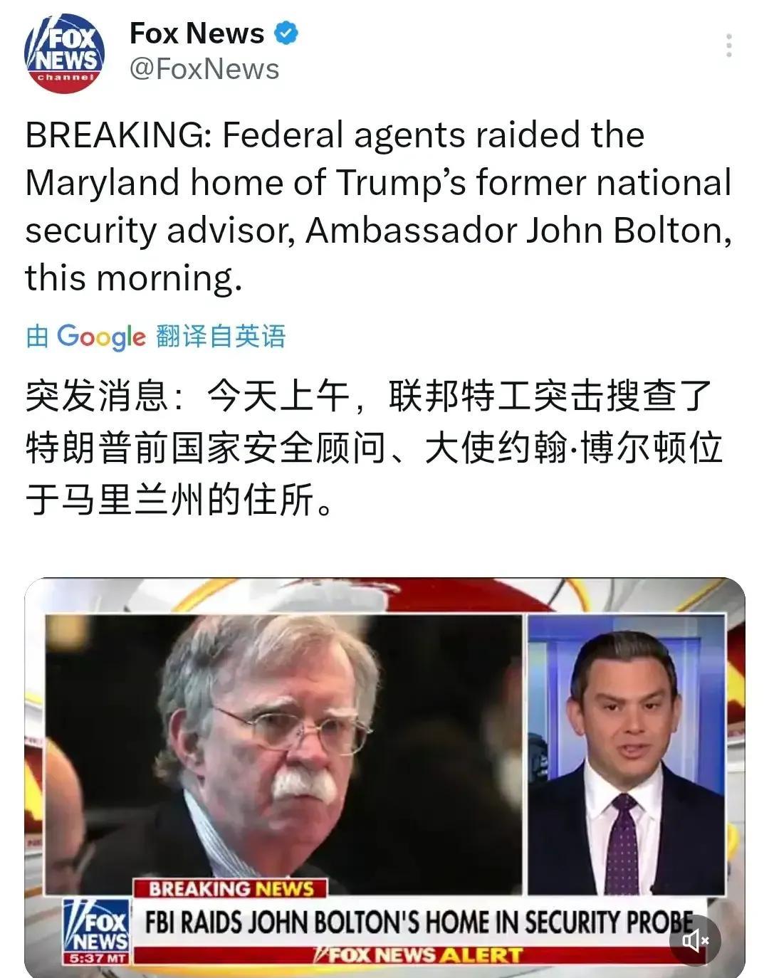 福克斯新闻网今晚(8月22日)报道:“突发新闻:今天上午,联邦特工突击搜查了特朗普前国安顾问、大使约翰.博尔顿位于马里兰州的住所。” 作为特朗普第一任期的国安顾问,两人共事仅17个月时间,后因政见不合被特朗普解职,博尔顿也就成了特朗普极具破坏力的批评者。特朗普今年上任后,向博尔顿发出警告并解除了其安保待遇,但博尔顿一如既往,对特朗普的国内政策到俄乌、巴以冲突以及对伊朗政策的攻击、批评声不断,特朗普终于忍可忍,今天对博尔顿下手,意在向外界表明,“清洗深层政府”从现在开始,博尔顿是第一个但不是最后一个。