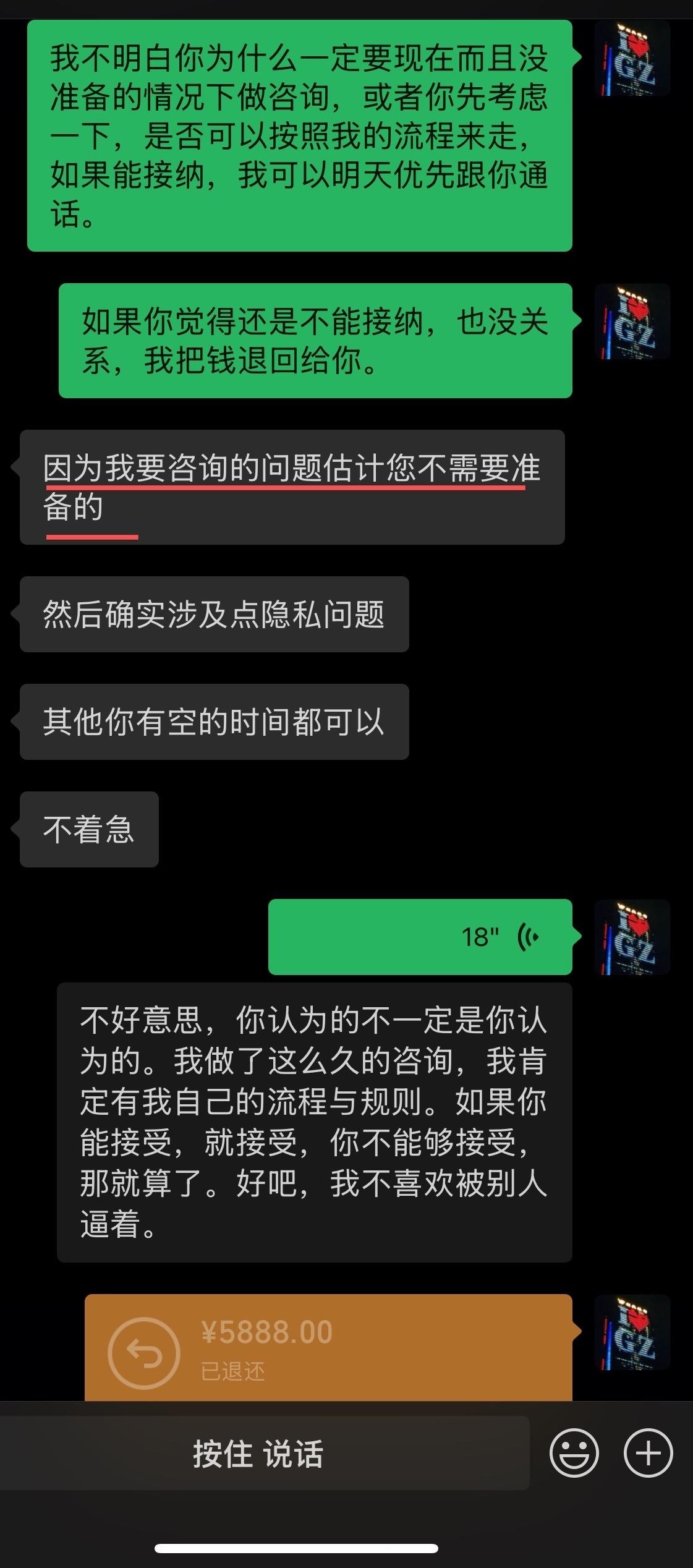 粤语:“有钱唔系大晒嘎”。你有钱也不是可以想怎么样就怎么样的。 前面我已经解释得很清楚:“如果我没有充足的准备,我给出的分析、建议也会不精确的。”这是我对自己工作的要求,也是对用户负责任的表现。 可是这个人,一而再,再而三地挑战我的专业,什么叫“我不需要准备?!” 我不是第一天做咨询的了,我现在定下的流程就是通过无数的经验总结得出的,是目前最高效、最科学的流程,这就是我的专业。 假如,你不想按照我的流程走,大可以详细说明原因、说明情况。而不是藏着掖着、故弄玄虚。 我跟这个人说了:“如果你很迫切,我可以明天优先帮你处理。”但你特么的先告诉我情况啊,不告诉我情况,还说“你不需要准备”,你以为的就是你以为吗?最后,我把钱退回给对方,并拉黑了。 对于“不尊重、缺乏认知、没有信任度、挑战我底线”的人,我是不会帮的。钱,没人嫌多,但我不爽,我宁愿不接。