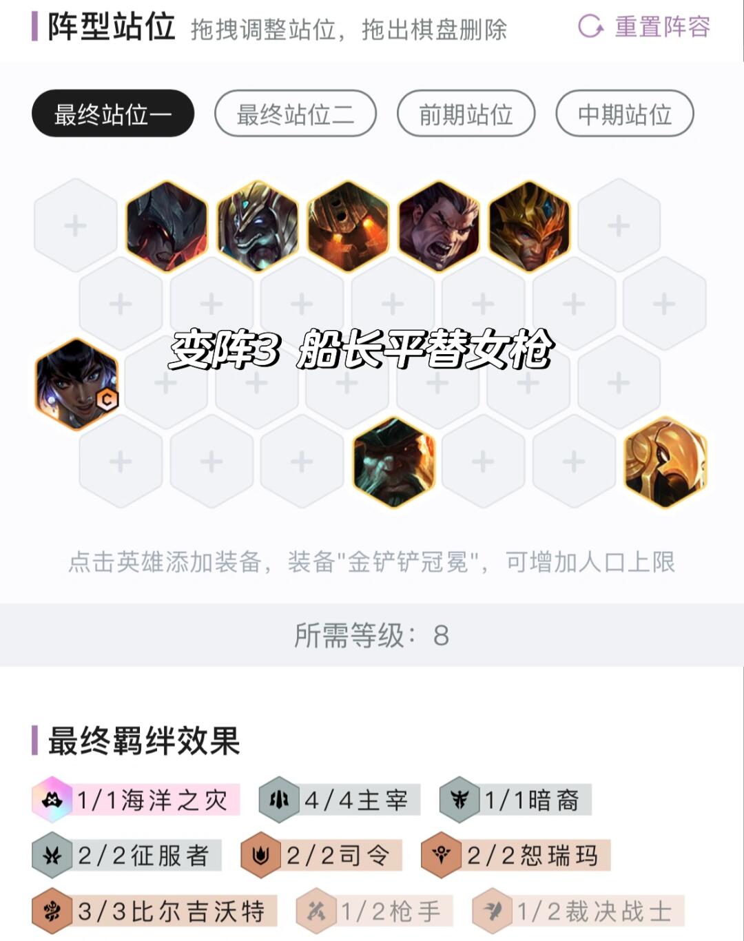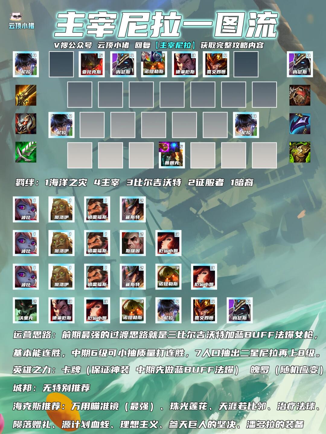 后期挂两个尼菈最强,没有可以代替大头/船长/6主宰/沙皇等棋子,船长是平替女枪的,也可以追三星女枪强度高于一星船长。