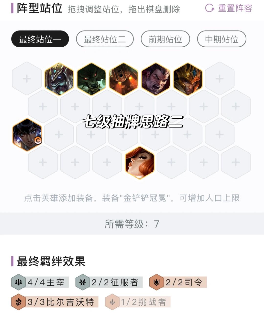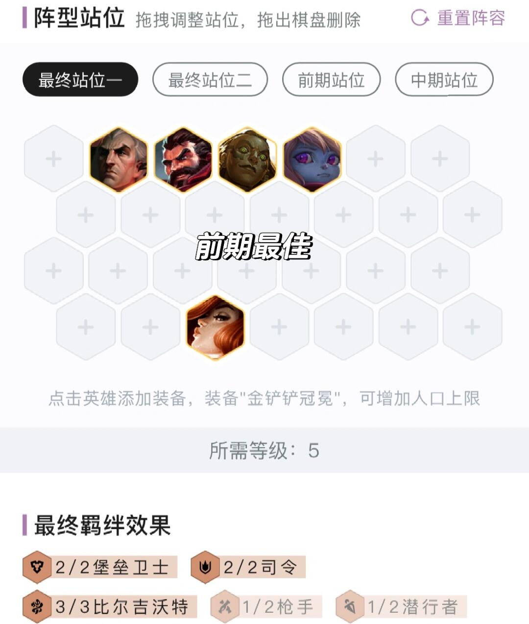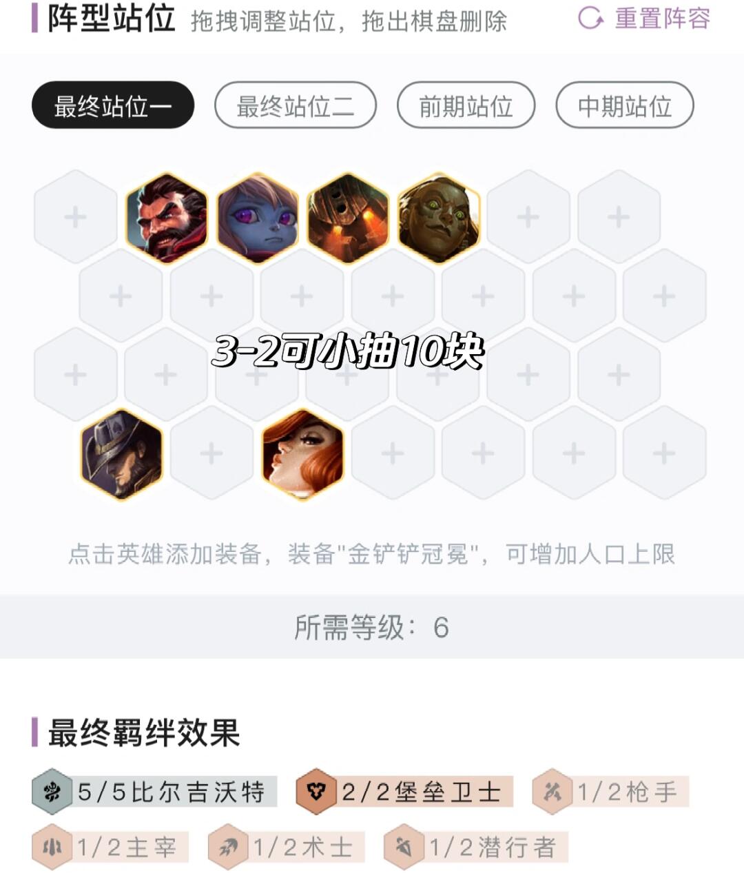 2、目前王者局玩尼菈喜欢六级抽牌,先抽出五比尔吉沃特和女枪,打连胜保血量上7找二星尼菈和一些前排卡皇子狗头等,不推荐上8抽盘,卡容易被抢完。