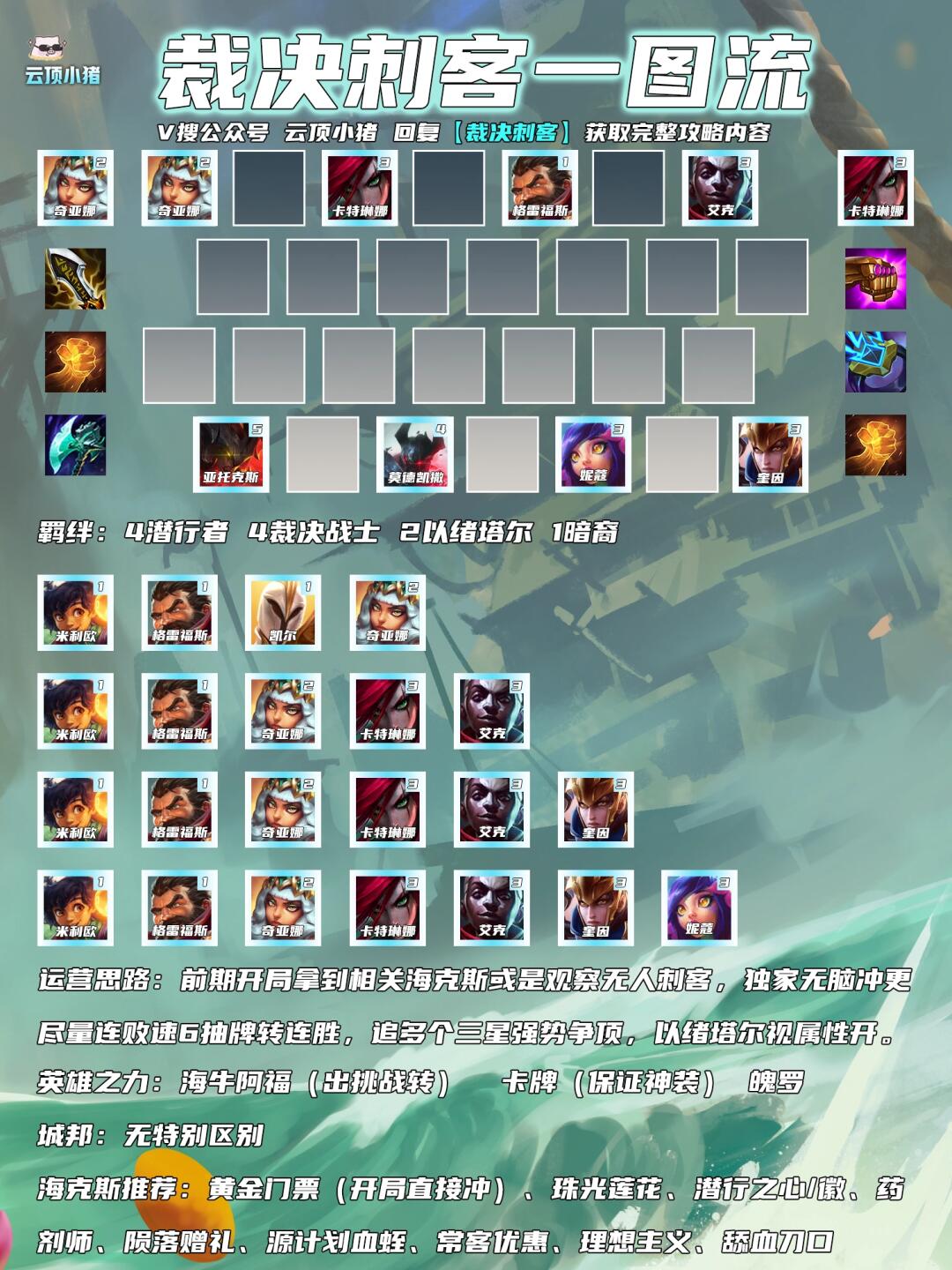 [偷笑R]今天给大家分享一套当前版本上分能力超强的刺客玩法,S9.5的刺客比S9可强太多了,潜行机制的修复和超强二费卡奇亚娜的加入,让新的刺客体系强度达到了T0.5的队列,独家能稳定上分。