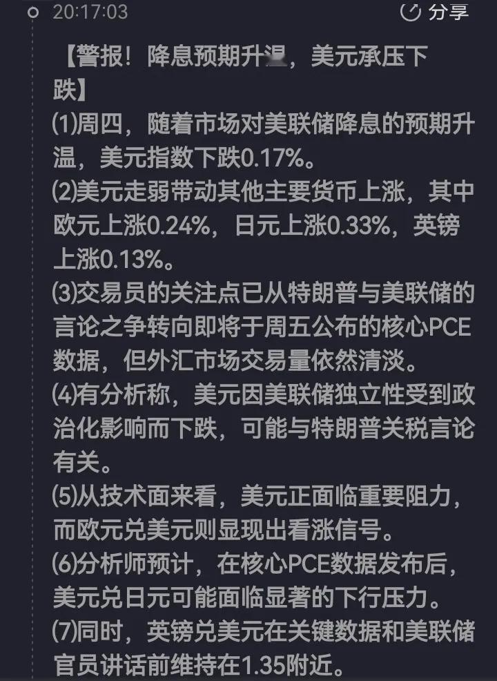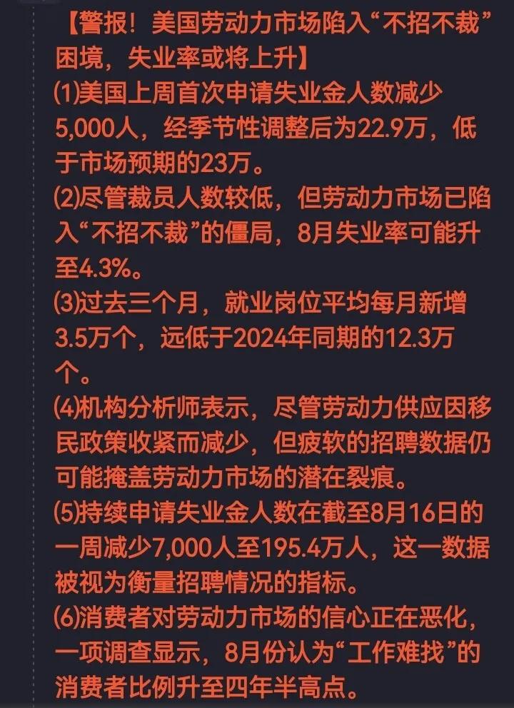 着图说话:指标更新 国际国内金价轴心3408.21/779.52,国际金价 步步高升剑指3500,受人民币升值7.12的影响 国内金价涨幅非常不理想,想突破800的可能 性几乎为百分之零点零零零。 马上9月份了,临近美联储降息,黄金ETF持仓 数据显示资本市场疯狂押注黄金上涨。 昨晚美国失业金申领人数减少,本来是利空黄 金,但被解读为美国劳动力市场处于困境(不 招聘+不裁员),反而利多黄金。 美联储营斗剧剧情发展到库克大姐起诉特朗普 越权,白宫官员表示要跟库克斗争到底,谁说 好男不跟女斗。 俄乌方面剧情发展,乌克兰无人机成功夜袭了 俄炼油厂,俄罗斯也无情打击了乌克兰,此举 感胁俄乌和谈令特朗普很不满。 英伟达业绩公布不理想,美股泡沫风险加大, 对冲基金跑到中国来避险,所以中国资产和中 国股市看涨,人民币大幅升值。 最后一则消息是印度倒卖俄油,美国官方用高 关税惩罚印度,说只要印度停止倒卖就降低关 税至25%,但见利忘义的印度不服,反而加大 9月份倒卖俄油的力度,明显破罐子破摔要跟 美国老大对若干,此串利好中国。 综上,9月份黄金和基金双丰收,值得我军期 待。