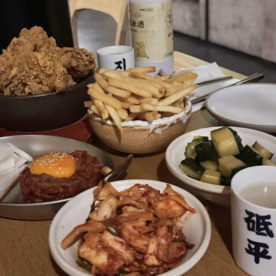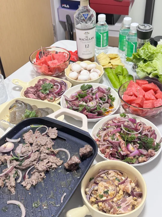 最近 好饱吖!爱惨黑松露薯条咯 干一瓶米酒🍶 粉晚霞超美耶~ 咖啡有点上头 朋友家的烤肉无敌美味😋 快楽的标配 是微醺和美味🥃 -