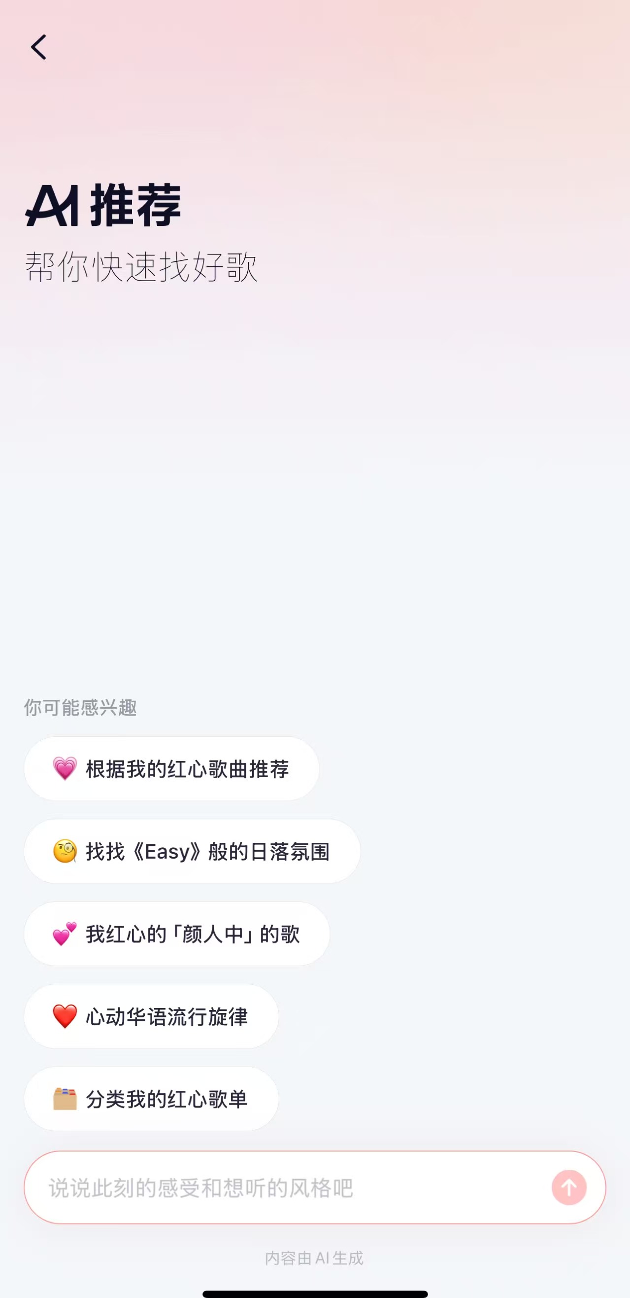 8月29日未来图灵发现,网易云音乐正式上线“AI推荐”功能,用户需通过搜索才能开启这一“帮你快速找好歌”的体验,其可依据红心歌曲、特定艺人、曲风氛围等维度精准推荐,也可根据个人需求一句话定制歌单,并支持一键保存。目前,该功能需在搜索框搜索体验。