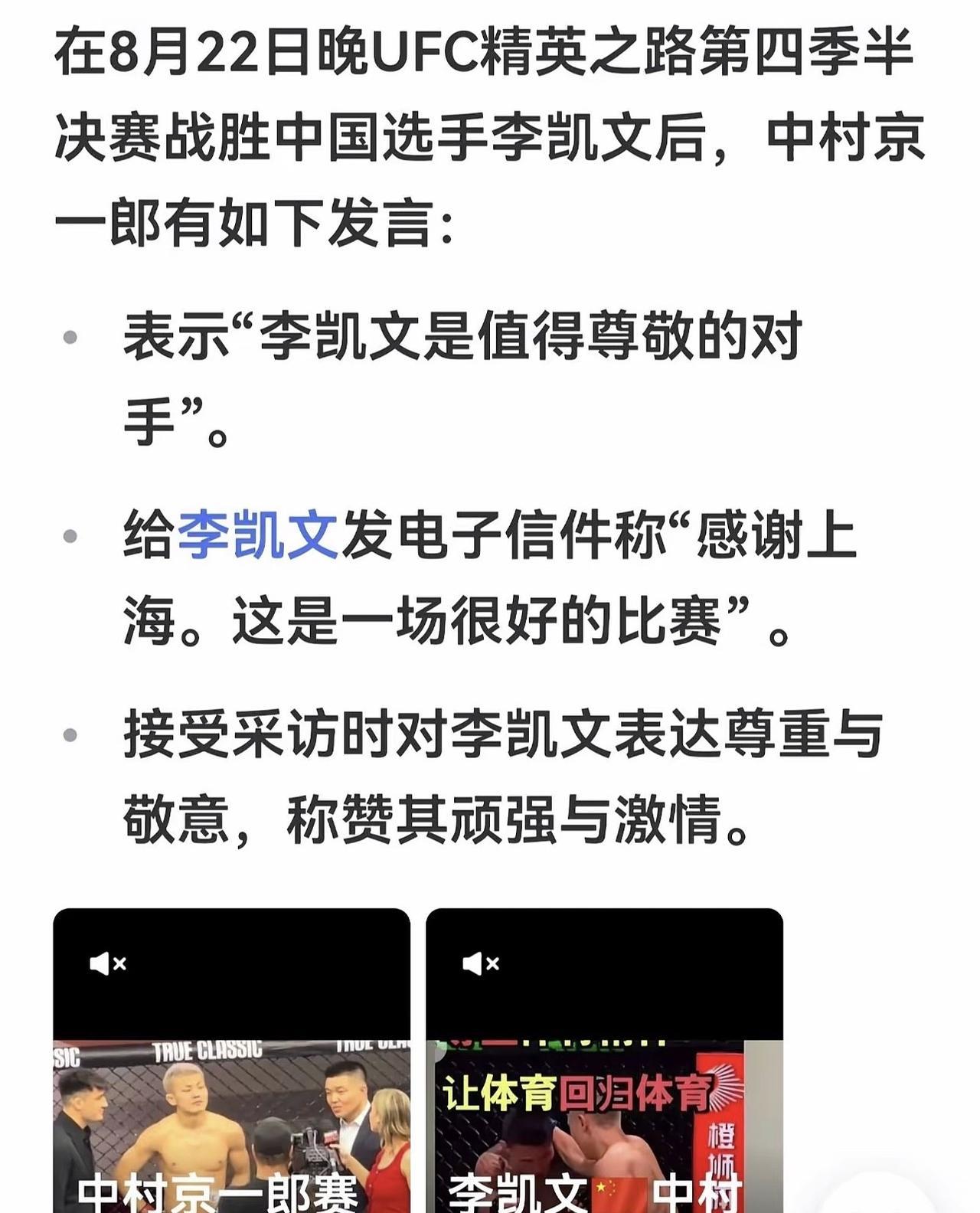 李凯文上台之前狂唱“大刀向………头上砍去!” 李凯文是台下有多狂,台上有多惨,一场综合格斗,李凯文没想到自己口嗨天下第一,但“爱国流量”却差强人意,格斗技术更不如人,被中村京一郎已经教其如何做人,打得其面目全非,估计他的苹果手机或华为手为都无法再面部识别解锁。竞技体育的第一课就是尊重对手,尊重体育精神,让体育成为体育。赛后中村京一郎发文感谢对手李凯文,并表示对其尊重、敬意与认可!