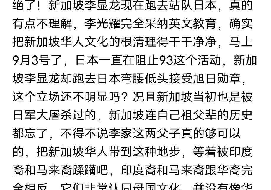 马来西亚印度裔警察只罚华人游客,不罚印度游客,新加坡华人博主去马来西亚旅游,结果因为吸烟被罚了500元,但是让它气愤的是4个人抽烟,这是印度裔女警只罚它一个华人,另外3个印度人直接放走! 其实这说明了东南亚的印度裔和马来裔非常认同它们的母国文化和母国同胞,所以虽然国籍不同,但是它们还是当做同胞,而新加坡的华人则不是这样的,李显龙在抗日胜利80周年,跑去给日本站队,一副点头哈腰的媚态,这是对中华文化的背叛,这就是新加坡错误对待华人的主体文化,把华人和中华切割开来,导致了华人不认同自己的主体文化,甚至是讨厌,更不用说对中国同胞的不认同了,这样就会导致新加坡华人缺乏凝聚力和团结,看看新加坡的印度裔和马来裔,或者说整个东南亚的印度裔和马来裔,它们对待自己的主体文化非常认同,因为他们就没有教育他们的后代去忘记主体文化,所以它们虽然是那些新加坡护照的印度裔和马来裔,但它们心里还是觉得自己是印度人和马来人,甚至高于认同它们是新加坡人,不像华裔拼命和中国切割,所以70%的华人,这几年选举已经有点出现选不过30%的印度裔和马来裔,我觉得新加坡华人很快会失去执政权的!