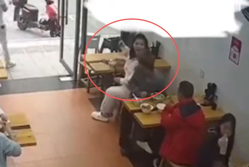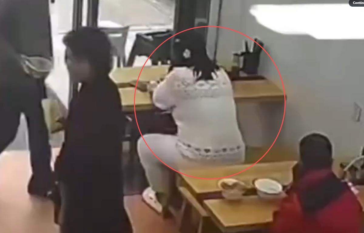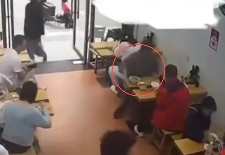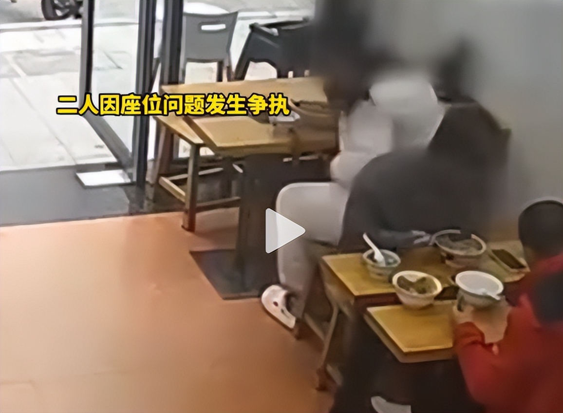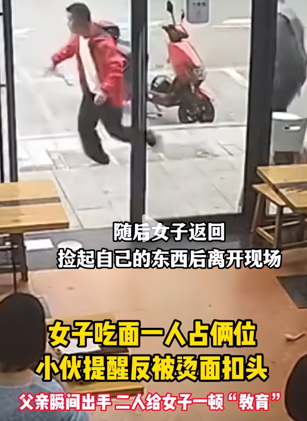 她这一挪,直接跨了两个座位,后面那桌父子就遭了殃,只见儿子端着刚点的面回来,想坐下却发现空间被严重挤压。