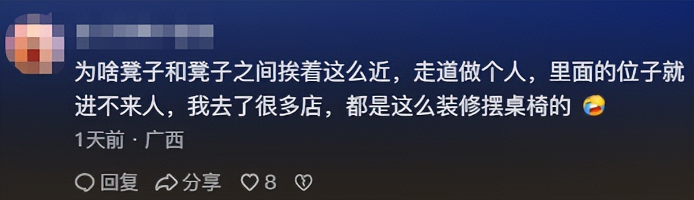 也有人提出,小面馆的桌椅摆放确实有问题,两排座位靠得太近,给体型较大的顾客留的空间不够,很容易让顾客之间产生摩擦,也应该付一定责任。