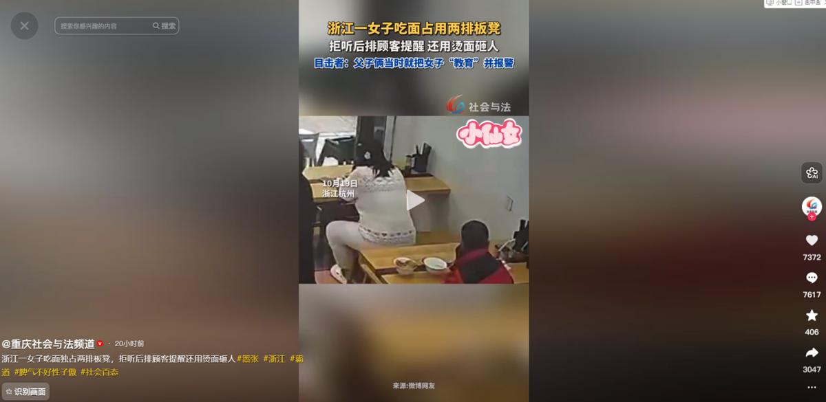 浙江杭州一家面馆里,一个女子独自吃面,因为身形过大所以就占据了两排板凳。