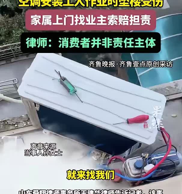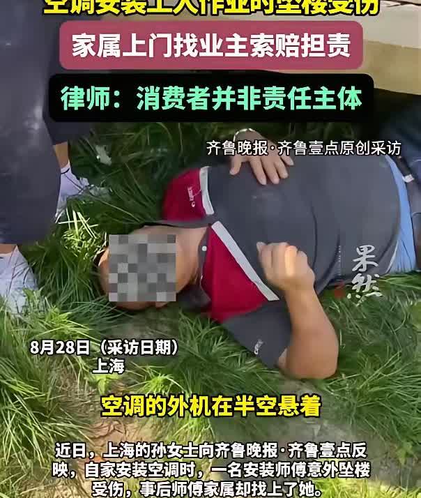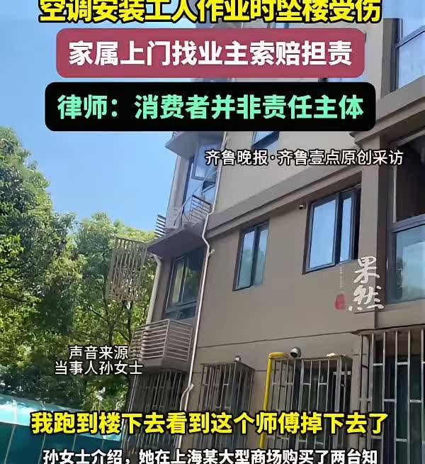 “这跟我有什么关系?”上海,女子在商场买了两台空调,师傅上门安装当天,女子在屋里就听“砰”的一声,过去查看发现一位安装工人意外从3楼坠落,事后伤者家属多次上门,认为事故出在她家,要求她来承担责任。 孙女士介绍,当天三名安装工人来到她家装空调。她正在屋内忙别的,突然听到外面“砰”的一声巨响。她赶紧跑过去看,发现一位师傅不见了,阳台外的护栏已经悬空。 有网友说:销售商派的安装人员,事故销售商承担。业主自行雇佣的安装工,业主承担责任。家属再来无理取闹,直接报警。 有网友说:空调安装,属于专业人员工作,安装费用包含在空调之中,完成安装才能发挥空调的使用功能的,作为厂家的空调,正规商场购买,发生这样的坠落事件,与业主有一毛钱的关系? 还有网友说:如果一辆货车在承运货物时发生车祸是不是货主要承担责任,肯定责任是车和车的所属单位,这么简单的道理都懂的 大家怎么看呢?