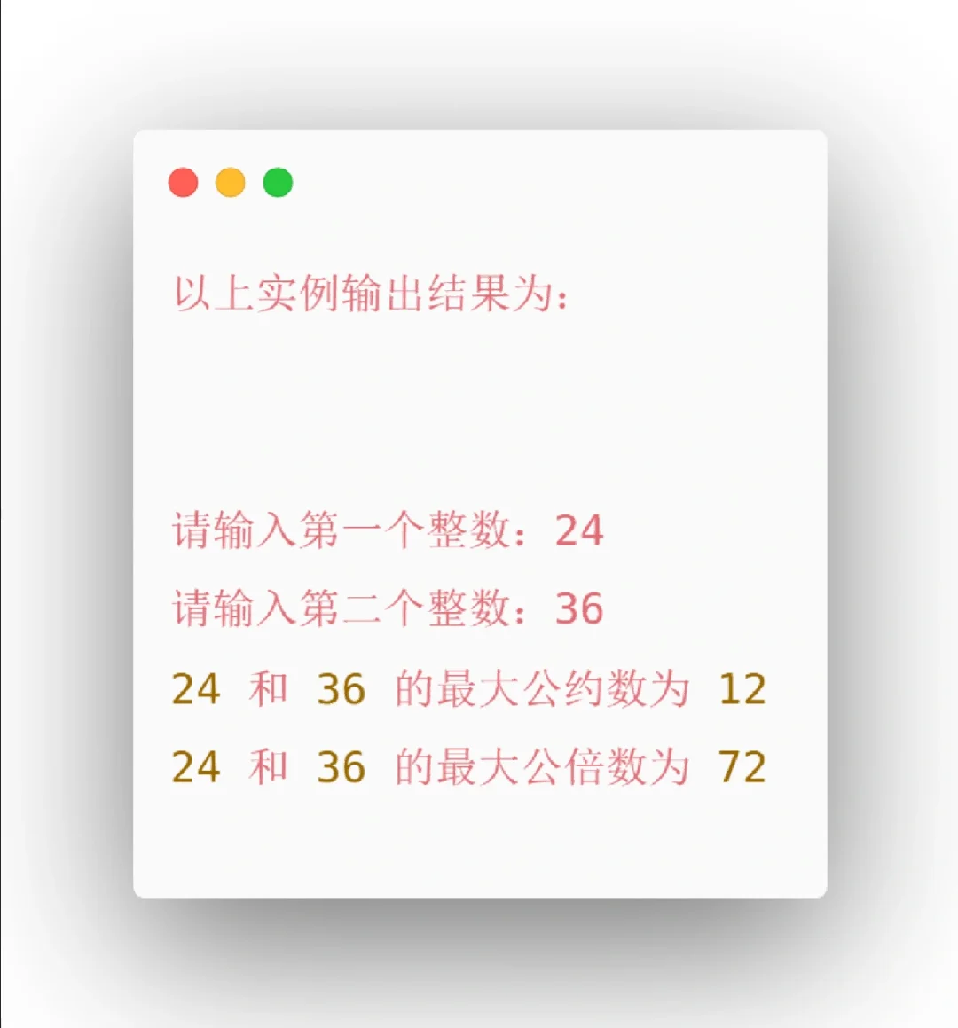 Python小项目[二R][五R] ~ [一R]要求: 最大公约数计算。 获取两个整数,求出这两个整数的最大公约数和这两个数的最小公倍数。 ~ [爆炸R]最大公约数的计算一般使用辗转相除法 [爆炸R]最小公倍数则使用两个数的乘积除以最大公约数 ~