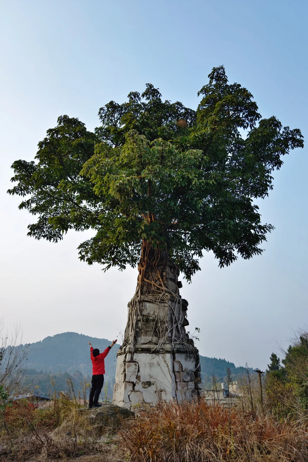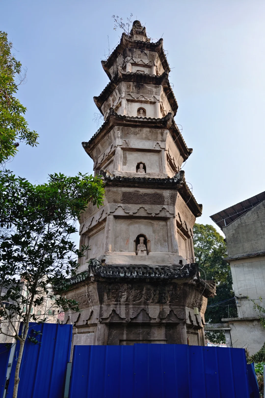 一棵古榕树依塔生长,形成“树抱塔”的奇观景象,感受到生命的蓬勃力量。据说此塔建于明代,每一层都有精美雕刻,但现在已经不能窥见了。