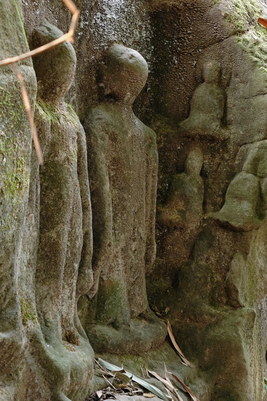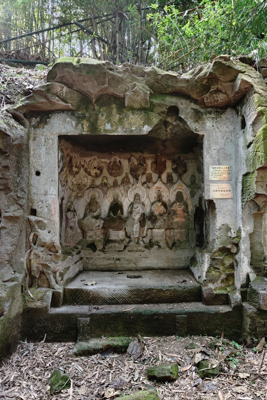 隐于屋后的一片竹林内,石刻造像损毁严重,无声倾诉着千年沧桑。