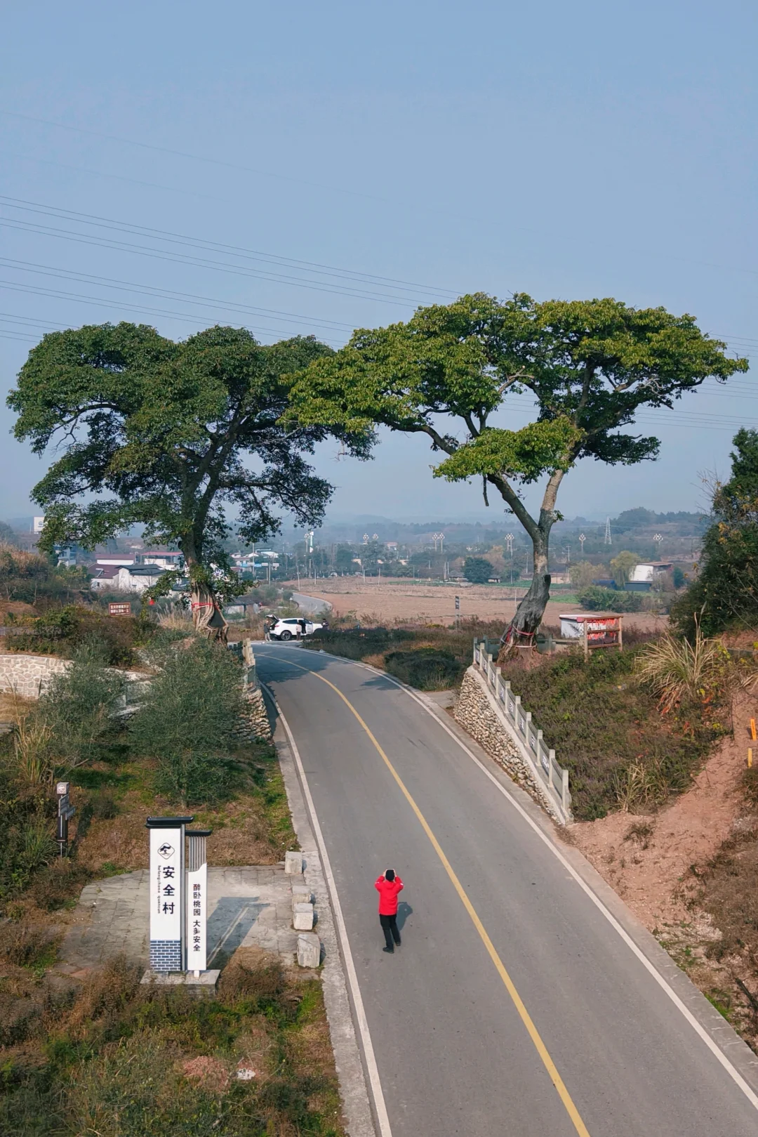 两棵高大繁茂的古榕树屹立于公路两边,图个好寓意。