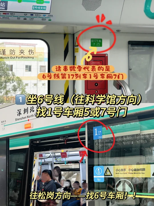 1️⃣坐6号线往科学馆方向,找1号车厢5或7号门(⚠️松岗方向——找6号车厢!!)