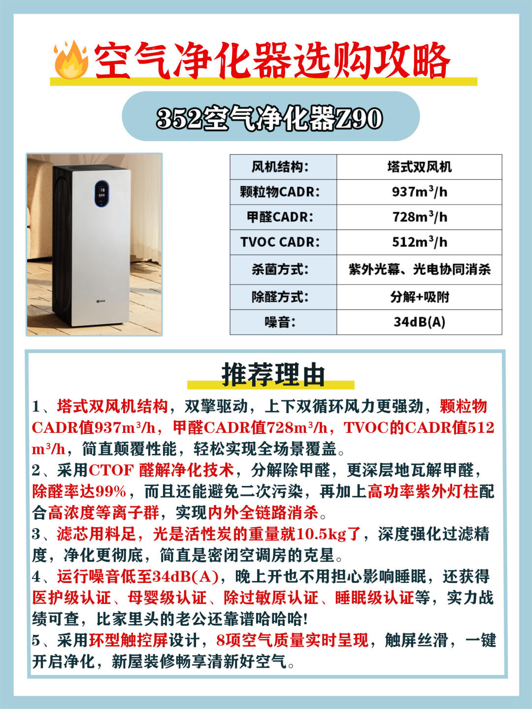 🔎经过多番对比下来,352家的这款Z90空气净化器真的太戳我了,塔式双风机结构,上下双循环风力更强劲,颗粒物CADR值937m³/h,甲醛CADR值728m³/h,TVOC的CADR值512m³/h,吊打同价位空净。