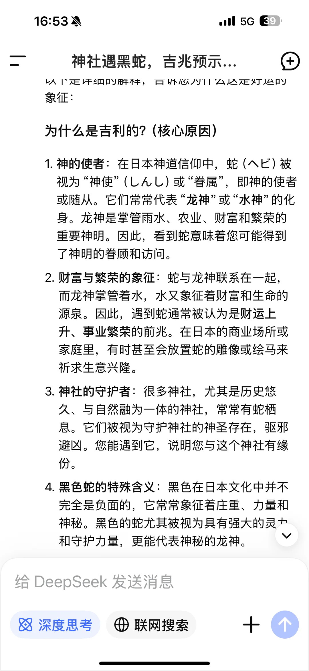 去后面稻荷神社的时候,鸟居中间小路有一段不是台阶,正走着缓坡的地面上突然窜过去个什么东西,一看一大截弯曲的黑色蛇身露在外面,纯黑的!头已经钻草里了,小孩子拳头那么粗,露在外面的蛇身大概有一米多长,吓得我不会动了[笑哭R]当时一个人都没有!帮我拍照的日本小哥刚过去一分钟,它不见了以后我立马狂奔,太吓人了啊啊啊啊啊啊[哭惹R]查ds说我看到了神様的使者要有好运了hhh如果有去这里玩的小伙伴注意点吧,也不知道有毒不🥲