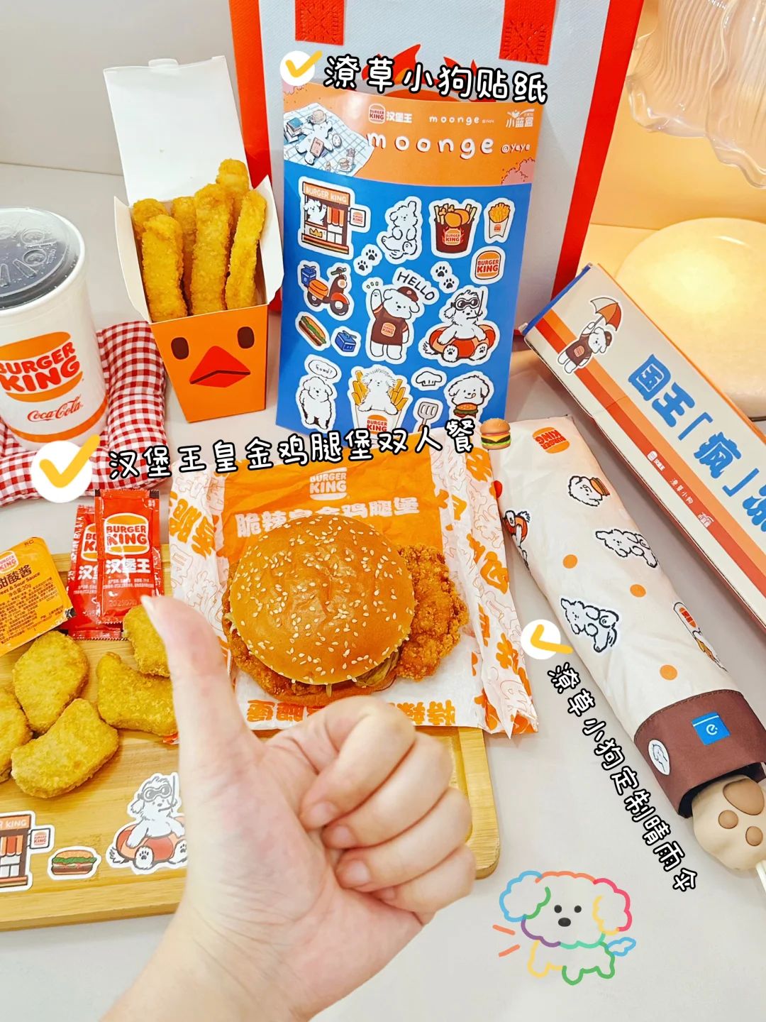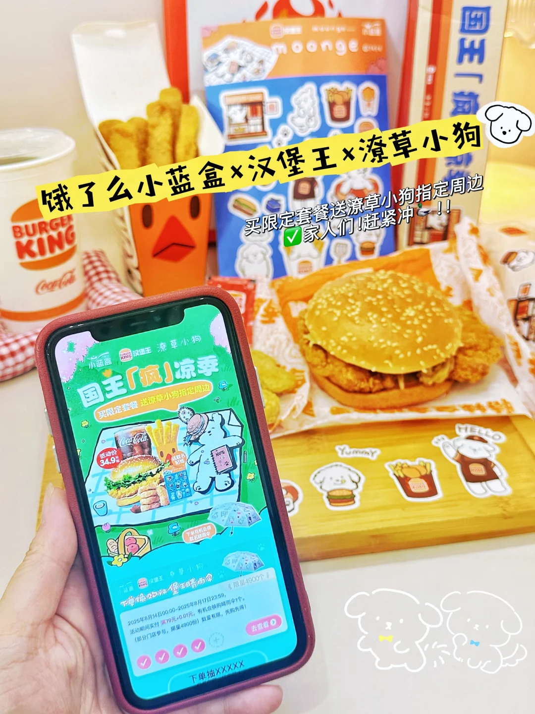 这次饿了么小蓝盒x汉堡王,推出了【国王疯凉季】的活动,在饿了么上面点汉堡王的限定套餐:皇金鸡腿堡4件套🍔,就送潦草小狗周边 !!