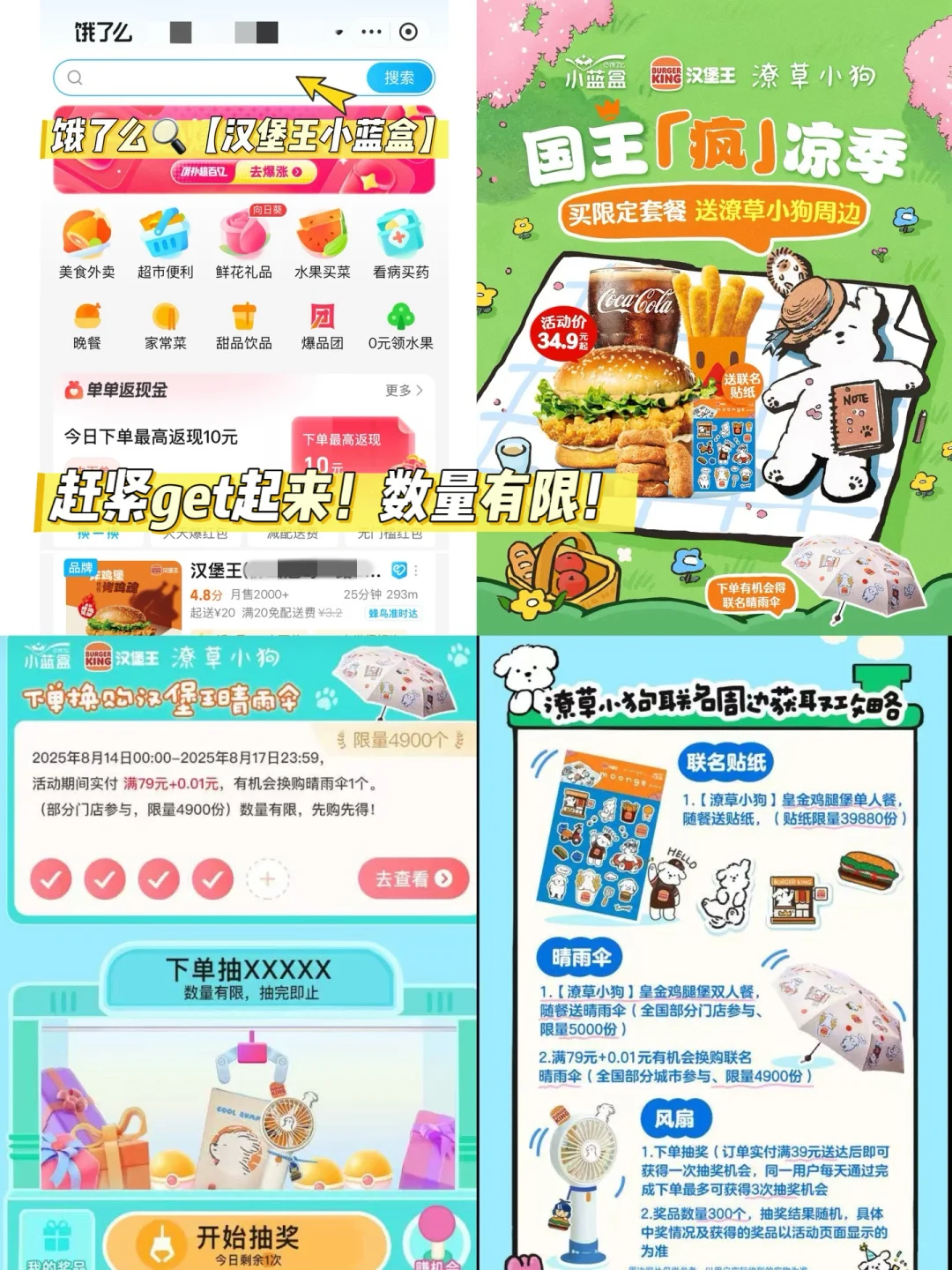 🤩隐藏彩蛋:✔️潦草小狗定制风扇:饿了么平台下单汉堡王订单实付🈵39r,订单完成后饿了么🔍【汉堡王小蓝盒】,返回🔙会场参与抽奖即可有机会获得!(同一用户每天通过完成下单最多可获得3次抽奖机会,奖品数量300个,抽奖结果随机,具体中奖情况及获得的奖品以活动页面显示的为准。)