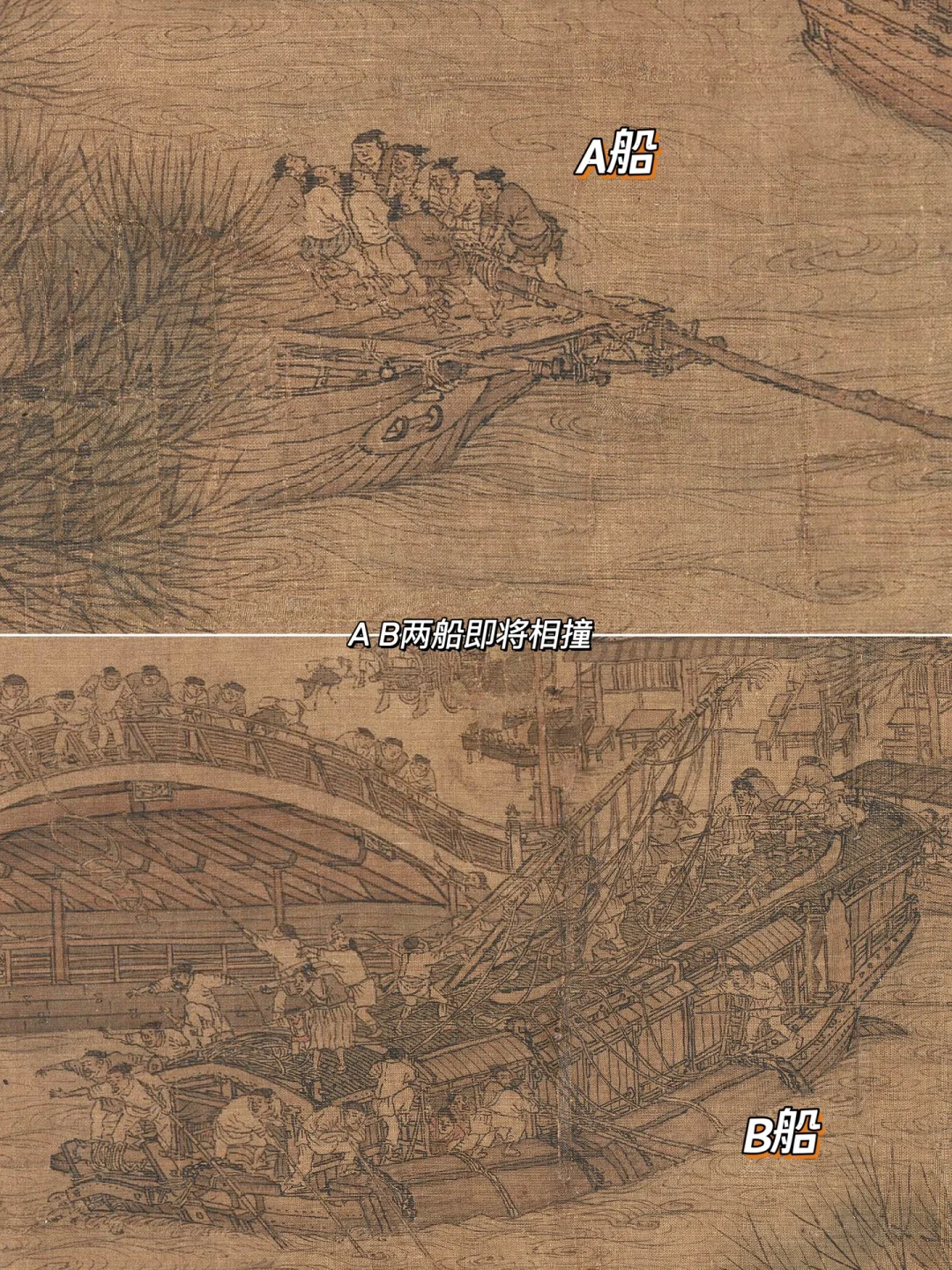 因为前方两船即将相撞,这是第二处险情。此时B船尤为惊险,又要躲避冲撞,调整方向,又要顺利过桥,松绳放杆,紧张感直接拉满。
