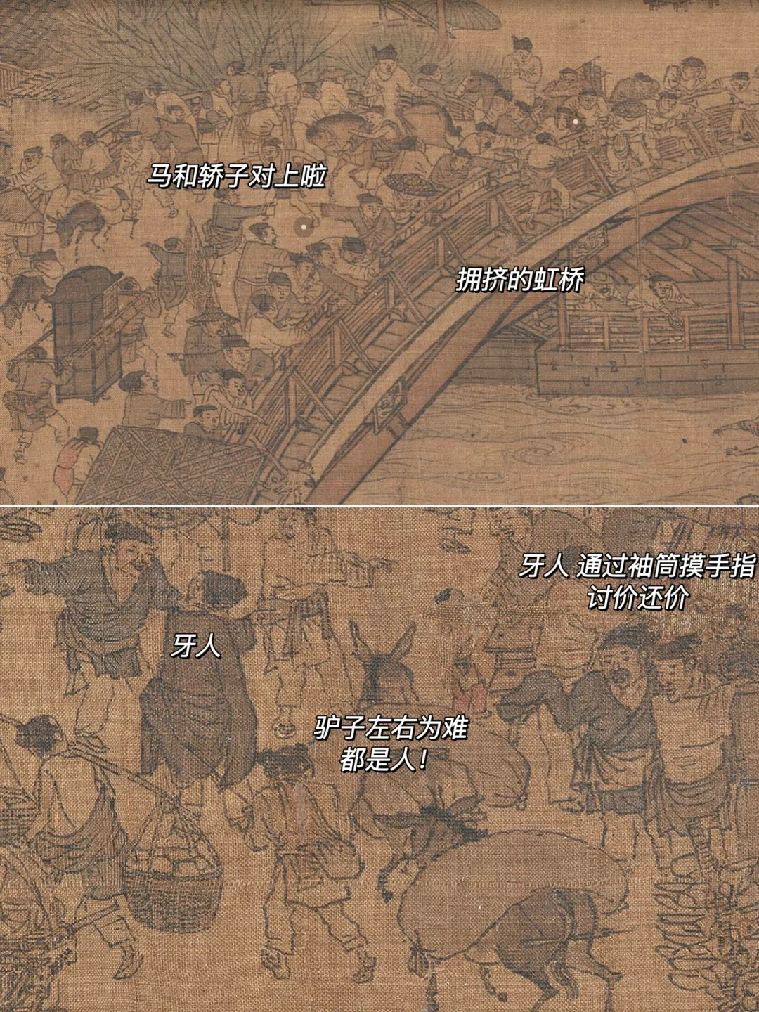 而桥上人群、驴马、轿队、店铺也是挤作一团。沿着街边你将看到袖子特别长的人,这叫牙人,属于中介。这不,一牙人正驱赶快撞上小孩的驴,可没成想,另一边的牙人也将和驴相撞!