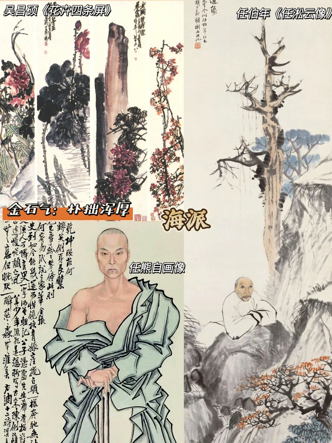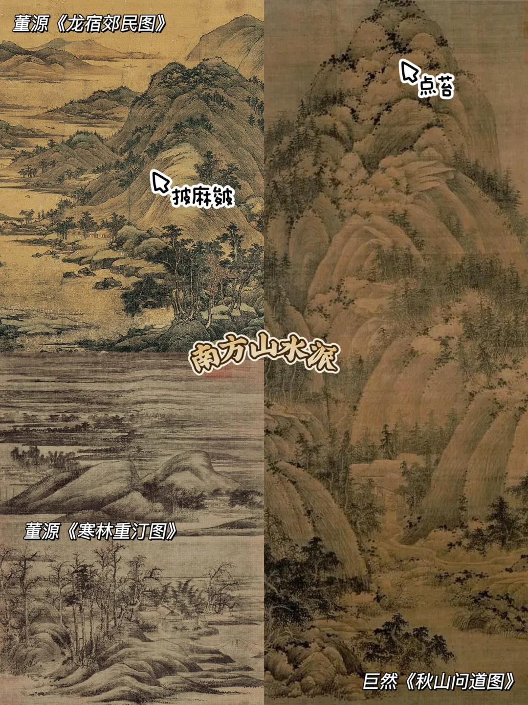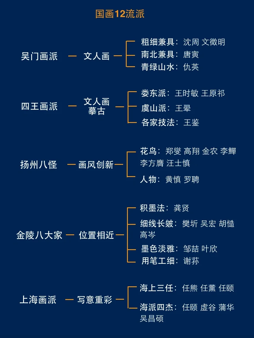 ✨国画自三国至今历经众多派系,有延续创新,也有对立不同。今天,我们便从12支重要画派入手,带你快速理清它们的关系。 🪷首先是六朝四大家,他们处于社会动荡、寄情宗教的时代,所以善画佛像。曹不兴影响最大,顾恺之、陆探微笔法周密,号为“密体”,张僧繇数笔成型,称为“疏体”。 🦜五代开始,花鸟画独立成科。黄筌画派细笔勾勒,为工笔,设色艳丽而富贵。徐熙画派以色作画,叫“没骨法”,风格清淡而写意。 ⛰山水画也急速发展。北方山水派以多视点融合的坚硬高山为景,荆浩善水晕墨章,施法自然;关仝以钉头皴、雨点皴、条子皴,现山体料峭;北宋李成、范宽均受其影响,风格上一个更深远、一个更雄壮。 🌊南方山水派多为平远、高远构图,呈山势平缓、草木丰润之景。董源创披麻皴展示山石纹理、巨然用点苔描绘远树青苔,北宋米氏父子承其技法,将简略、幽然发挥至极。 🌅时至南宋四家,画风有所改变。李唐创水墨淋漓先河,马远、夏圭喜局部构图,得马一角、夏半边美名,刘松年专小景山水之长,四人作品均意境深远。 🎍到了元代四大家,文人画占据主流,画家师承董、巨,结合诗书印画抒情表志。黄公望创浅绛山水,素雅青淡;王蒙发明解索皴,行笔曲密;倪瓒用折带皴,表现层石;吴镇以渔夫墨竹,一展苍茫。 🏞明代中期,吴门画派承元文人画衣钵,沈周取法王蒙、兼学董巨;文徵明师从沈周,画法粗细皆有;唐寅借鉴南宋院体,风格俊逸;仇英善作青绿山水,雅俗共赏。 👑清朝四王画派深受董其昌影响,他将唐宋院体归为北宗,五代山水、米家父子、元四大家归为南宗,认为北宗不及南宗。 因此王时敏、王鉴、王翚、王原祁四人多为摹古南宗,正统有余,创新不足。 ♣️宫廷以外,多元化逐渐显现。扬州八怪中,郑燮善画竹石;高翔以指为笔;金农好写墨梅;李鱓破笔泼墨;黄慎狂草写意;罗聘喜鬼向佛。 🗺金陵八大家中,龚贤主用积墨法;吴宏以碎乱直线画山;邹喆最近明人气格,谢荪用笔非常工细,他们画风不同,但因地理位置相近,自成一派。 🎨最后要说的海派,由大写意水墨和重彩组成。前期海上三任,任熊精于绘人;任薰工写兼善,任颐笔墨多变。 后期海派四杰,除去任颐,还有以拙取巧的虚谷、湿笔作竹的蒲华,以及追求金石书画的吴昌硕。 他们共同为近代国画掀开新的序章。