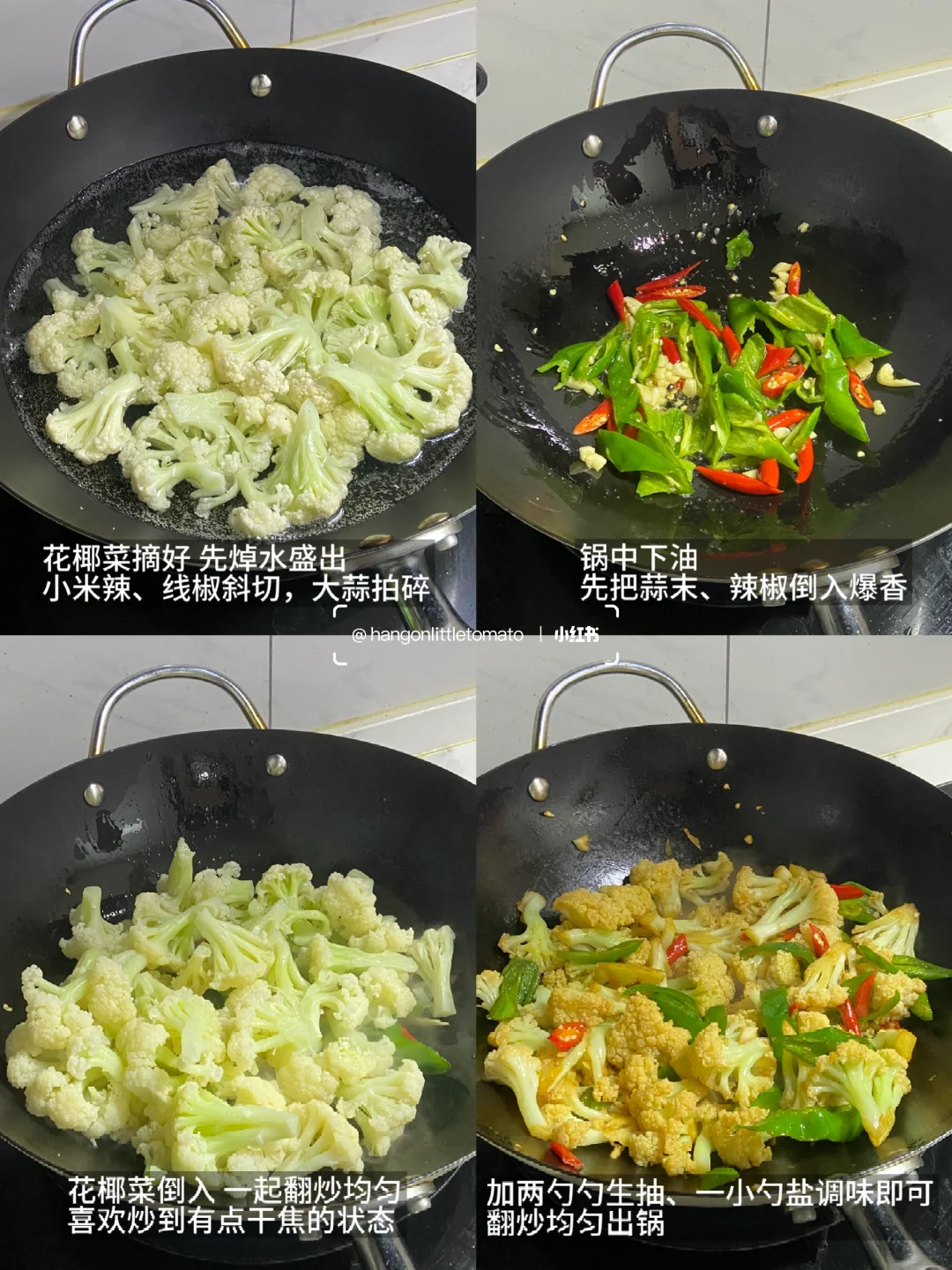 2)锅中下油,先把蒜末、辣椒倒入爆香,花椰菜倒入,炒到有点干的状态好吃,加两勺生抽、一小勺盐调味即可,翻炒均匀出锅
