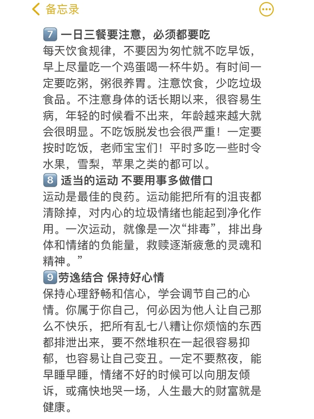 健康的身体对于我们而言真的很重要!一定一定要保护好自己的身体,健康是最大的财富,一定要少生气,学会调整自己的心态,这样才能在教育这条道路上不倒下,希望大家都能身体健康,每天快乐