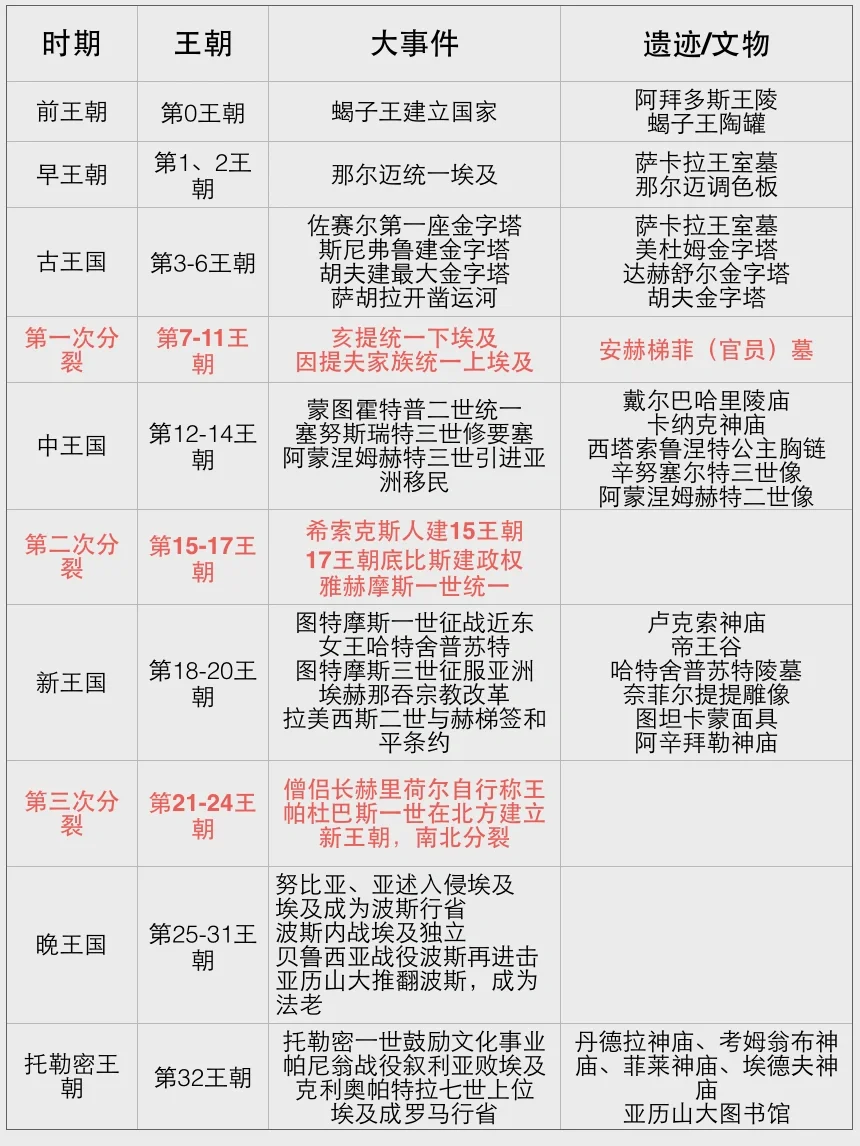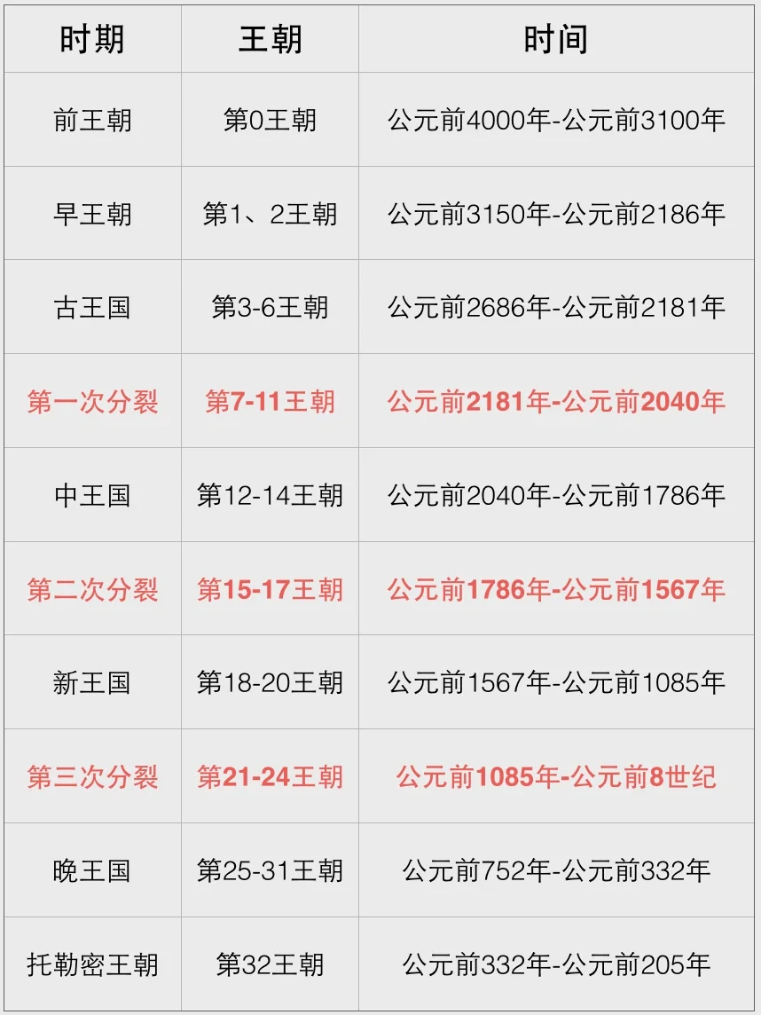 考古专家把埃及分成了10个时期,33个王朝,其实用三个分裂隔开还挺好分辨的。