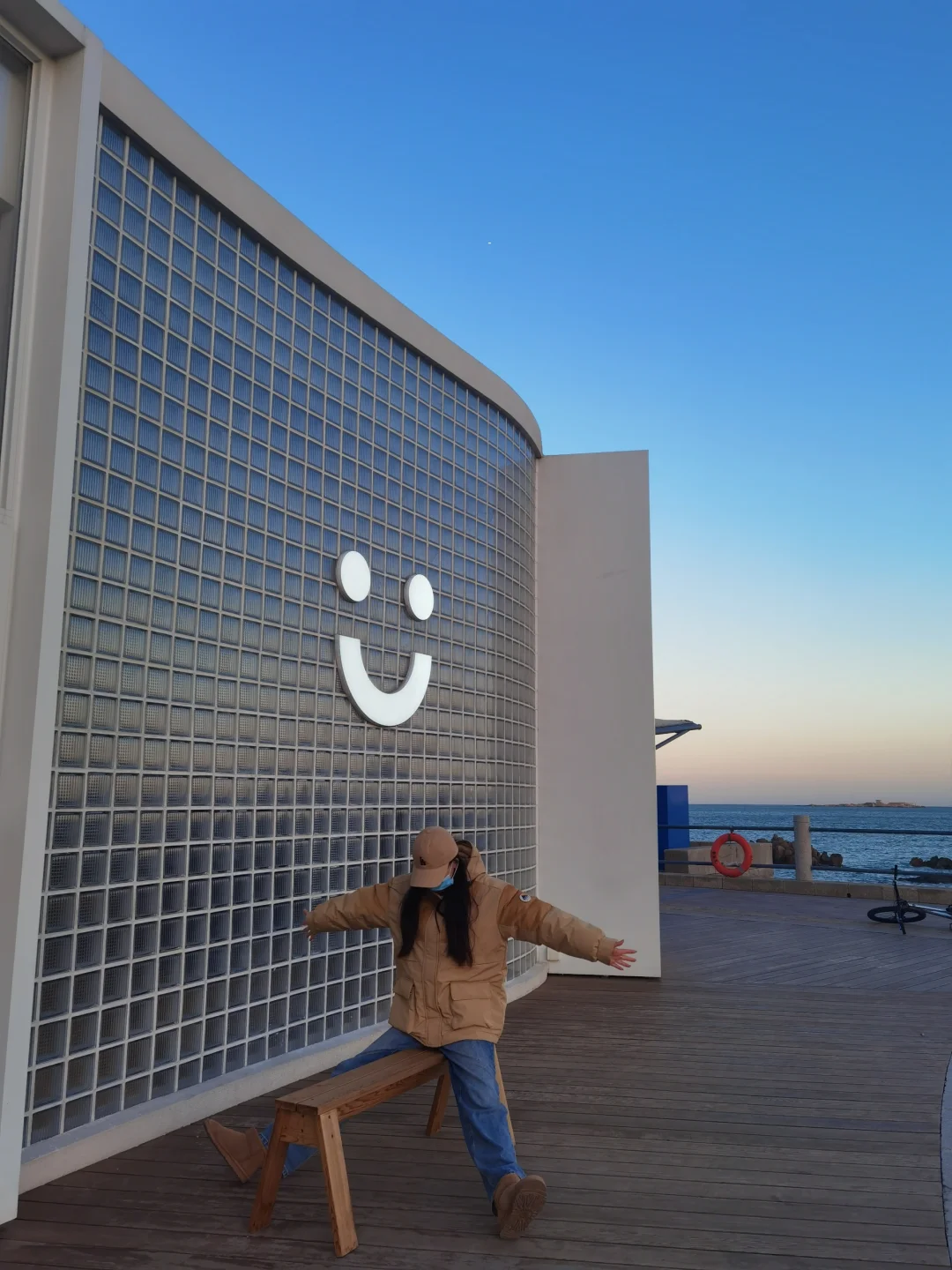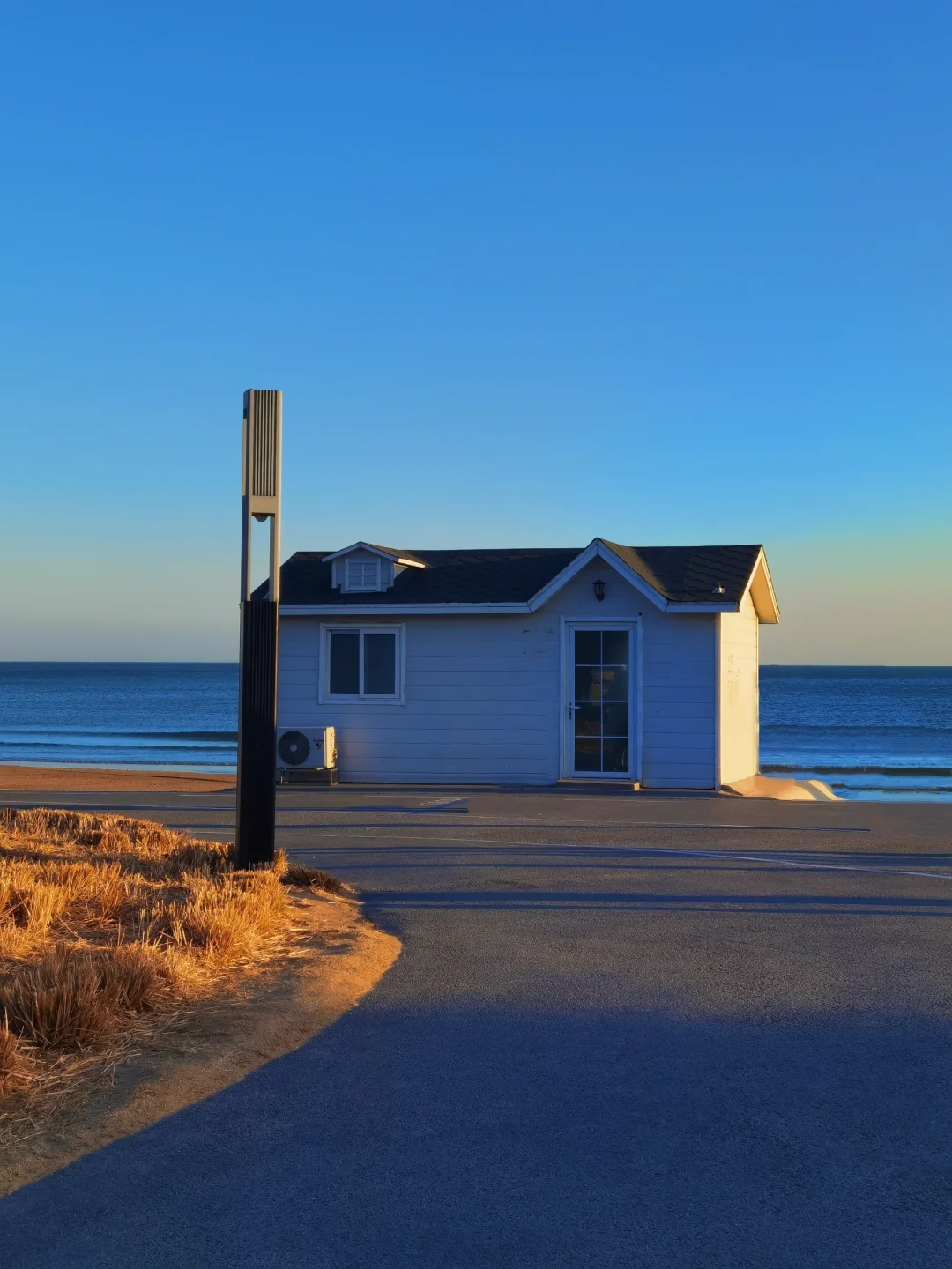 地铁2号线石老人浴场B2出,看日出yyds,定位浩运海鲜大排档(石老人海水浴场店)拍超🔥的白房子~林俊杰同款哦!退潮后拍隐藏洞穴很出片,但要导航大邦足球俱乐部哦!