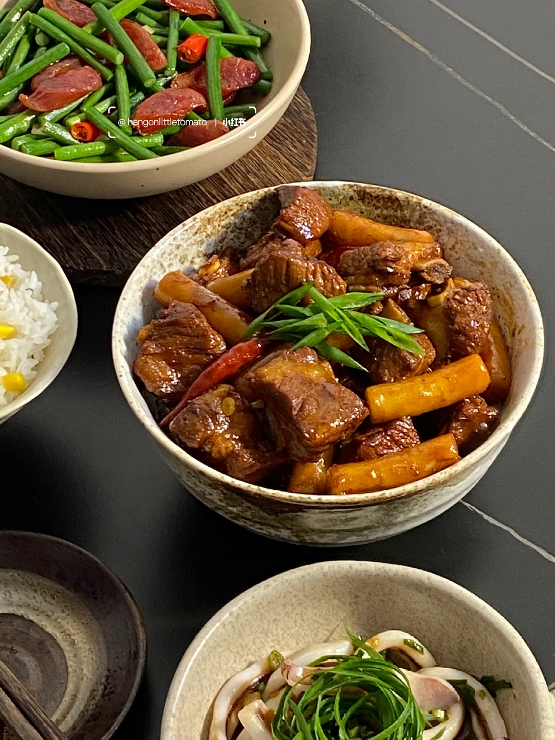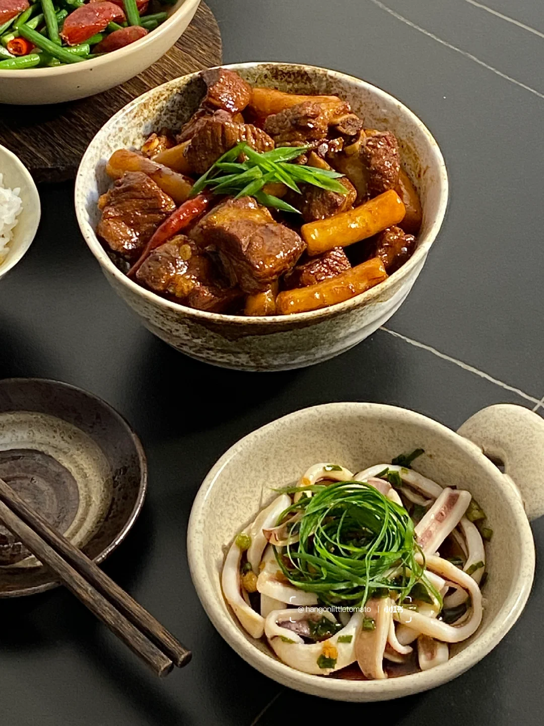 今日菜谱📜年糕小排 蒜苔腊肠 葱油鱿鱼🥢