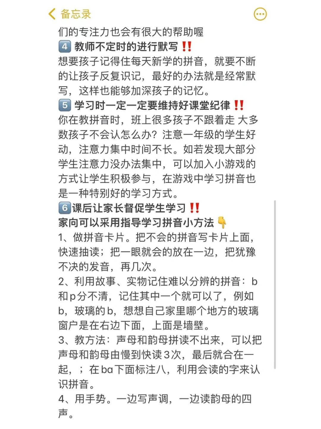 一年级的孩子犹如白纸一张,不认字,习惯也要从头培养。拼音怎么教?学好拼音才能借助拼音识字和阅读。拼音基础打不好语文可能也会学不好!老师每天都要钻研这些问题,真的很崩溃!作为一点教学经验都没有的老师,应该如何适应一年级教学呢!叮叮给大家分享一期拼音教学小建议👇 1️⃣学习拼音儿歌‼️ 可以上课时播放拼音儿歌,也可以在课间播放拼音儿歌。听歌孩子不会抗拒,而且从音调到朗朗上口的歌词,给孩子形成习拼音象形的辅导,就很容易记忆。例如:ao最圆,像两个穿着厚厚棉袄的娃娃,ou像莲藕长在水缸里,iu像瘦瘦的孩子跳泳池游泳。 2️⃣一定一定要多读‼️ 可以老师带领学生读(如师生合作读,小组赛读,大小声读),重要的话加粗!记住一些小口诀,“张大嘴巴aaa,嘴巴圆圆ooo”,这个口诀在很大很大程度上能帮助小朋友记住。 3️⃣ 准备一本描红本‼️ 小朋友的记忆力其实很好,多描让小朋友模仿,好记性不如烂笔头。描的多了小朋友就很惯性的记住了,而且在描的过程中对于他们的专注力也会有很大的帮助喔 4️⃣ 教师不定时的进行默写‼️ 想要孩子记得住每天新学的拼音,就要不断的让孩子反复识记,最好的办法就是经常默写,这样也能够加深孩子的记忆。 5️⃣ 学习时一定一定要维持好课堂纪律‼️ 你在教拼音时,班上很多孩子不跟着走 大多数孩子不会认怎么办?注意一年级的学生好动,注意力集中时间不长。如若发现大部分学生注意力没办法集中,可以加入小游戏的方式让学生积极参与,在游戏中学习拼音也是一种特别好的学习方式。 6️⃣课后让家长督促学生学习‼️