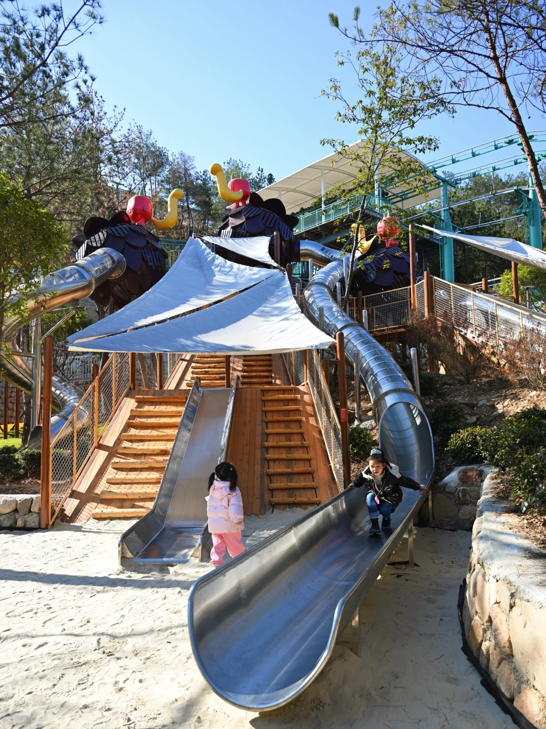 停车场→坐景区大巴到景区门口(车程5min)→坐摆渡车上山(车程5min)→坚果乐园→路极飞车→悬崖过山车(连刷了3次)→景区门口→坐摆渡车上山→围炉煮茶→蒙奇穿越→走上山又刷了一遍路极飞车下山→月下天镜