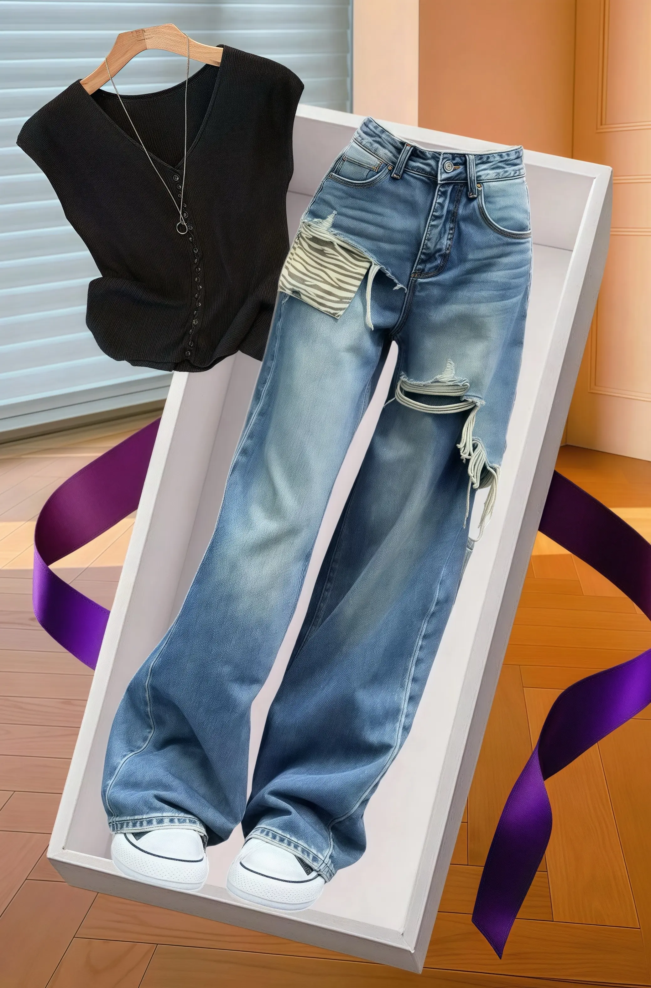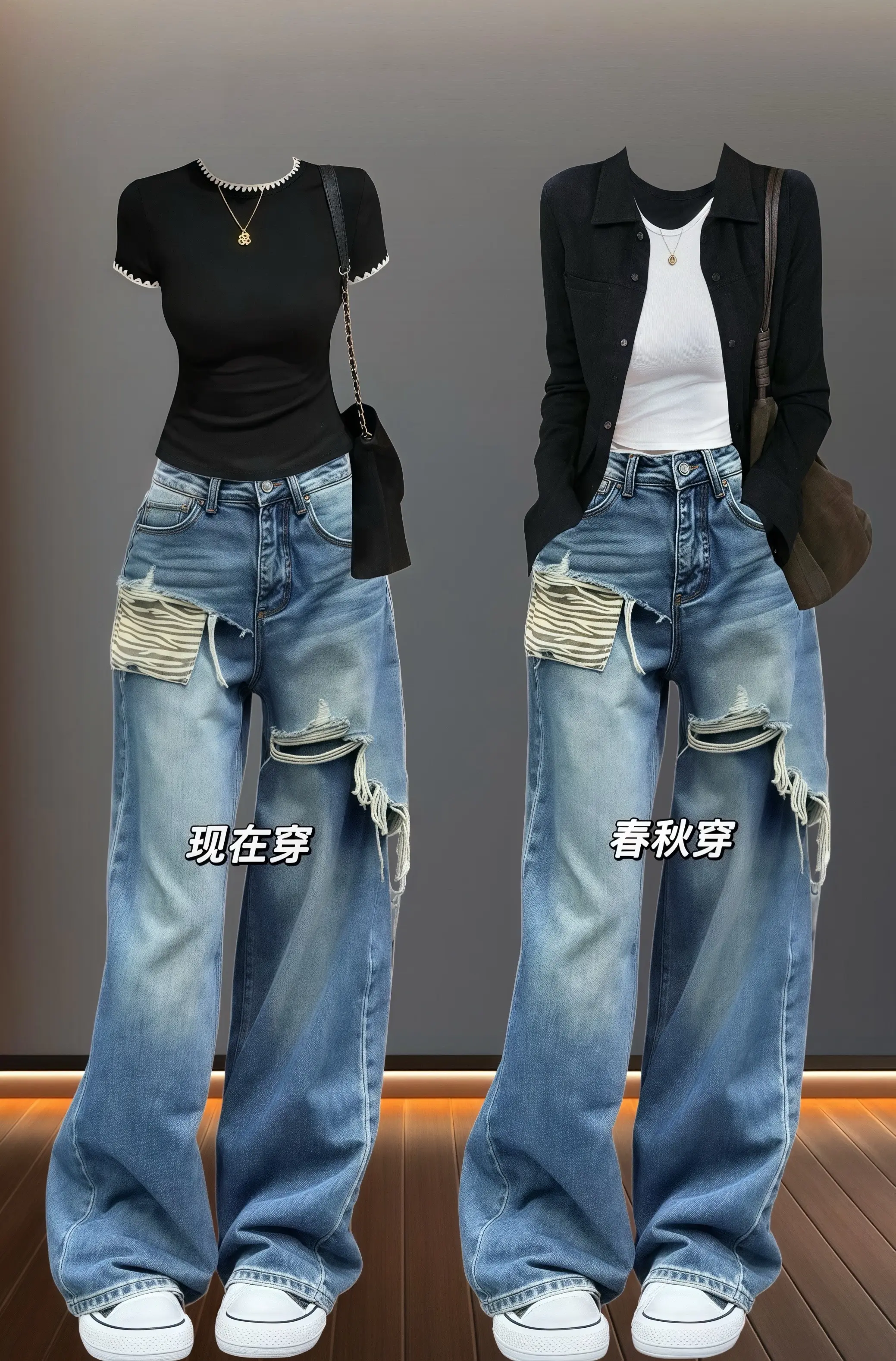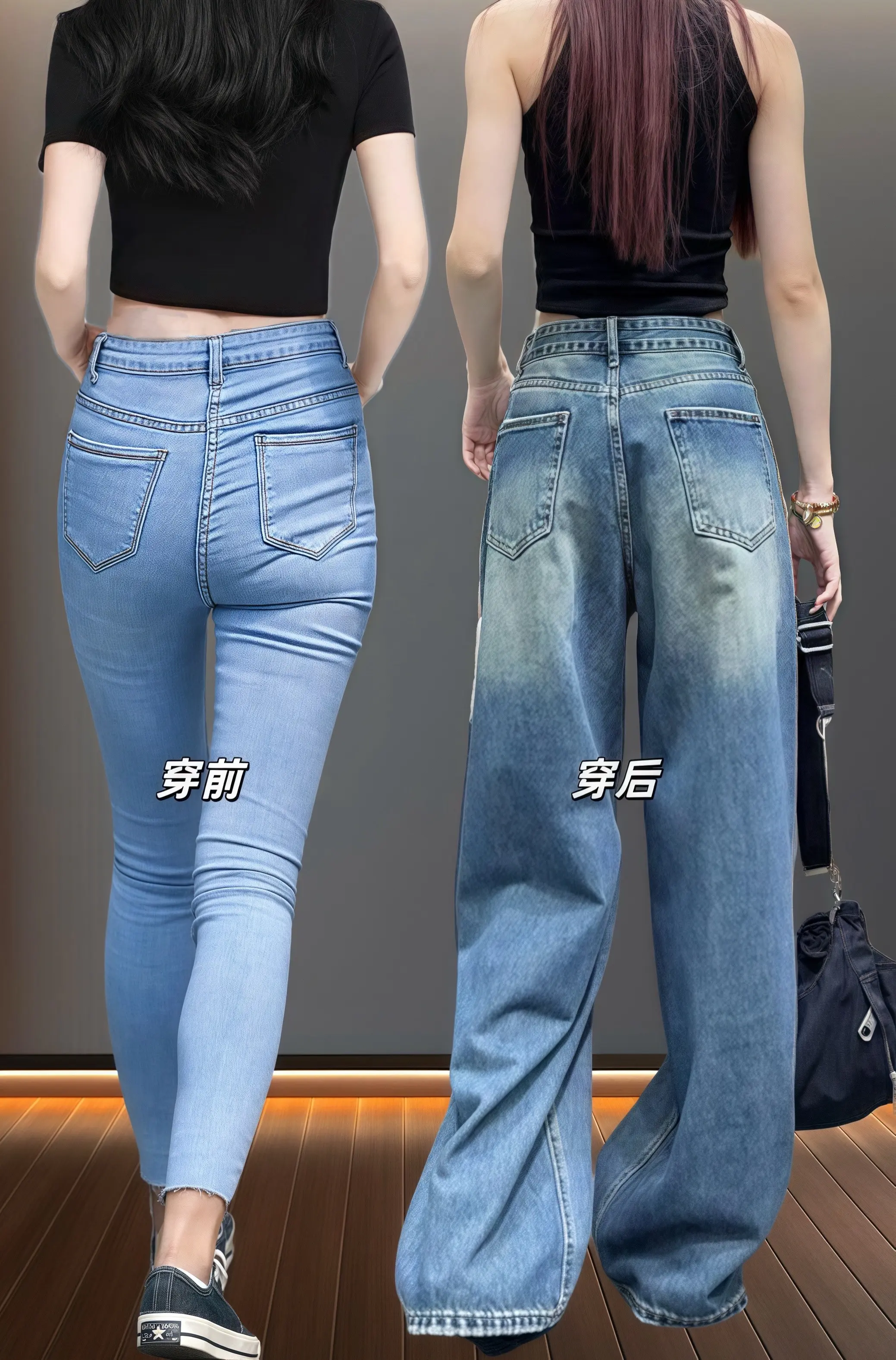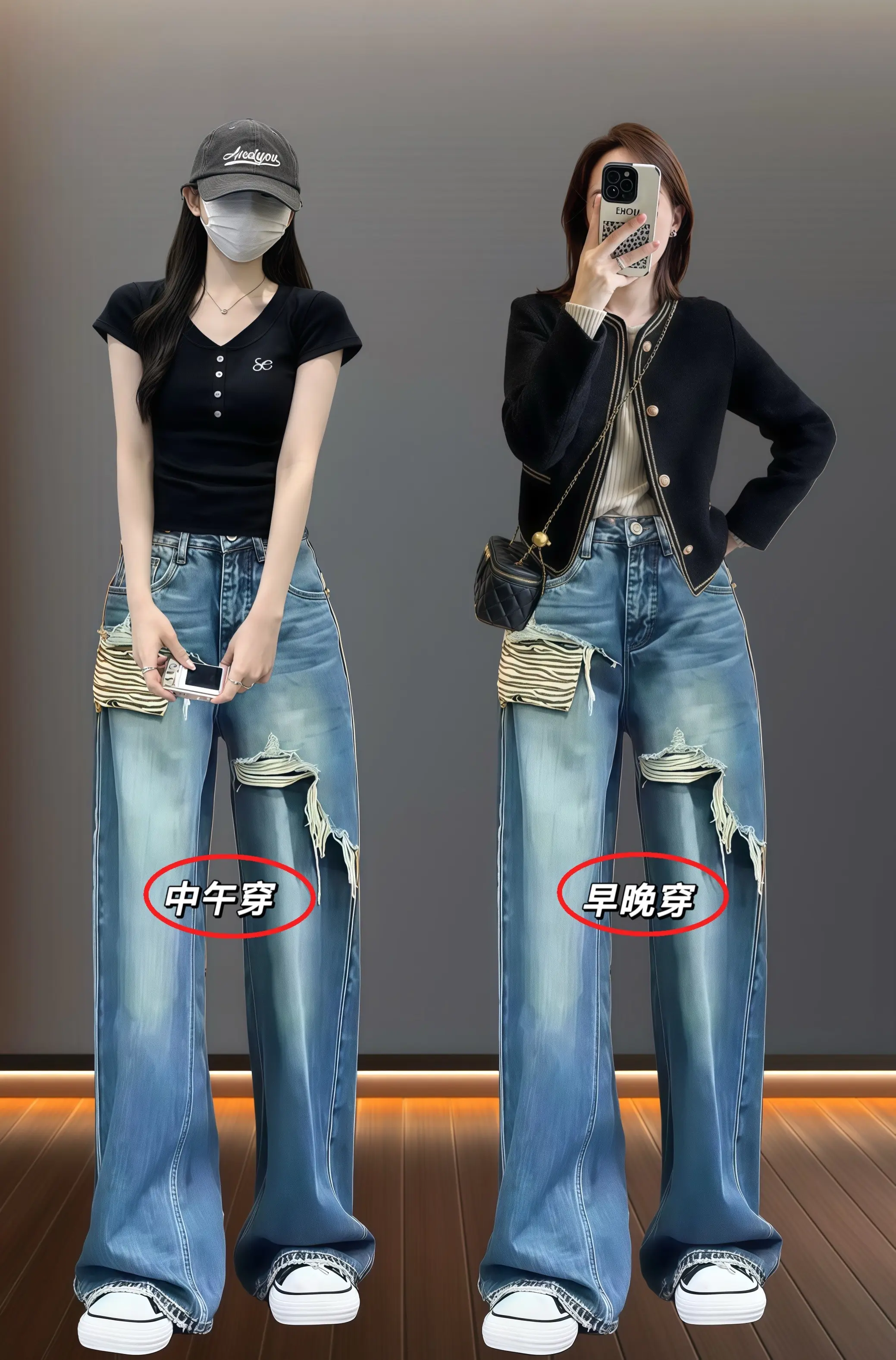 入秋想秒变时髦精?这条高腰破洞阔腿牛仔裤你可别错过! 高腰设计超懂扬长避短,穿上瞬间提高腰线,小腹赘肉统统隐形,轻松拿捏大长腿既视感。宽松阔腿版型,完美遮住腿部瑕疵,不管是 X 型腿还是小粗腿都能被巧妙修饰 ,走路带风,随性又自在。膝盖处的破洞设计是点睛之笔,为整体增添潮流感,个性又吸睛。经典牛仔蓝适配度满分,搭简约白T清爽减龄,配衬衫又能营造职场干练风,轻松hold住各种场合。选它,轻松实现秋季时尚自由!