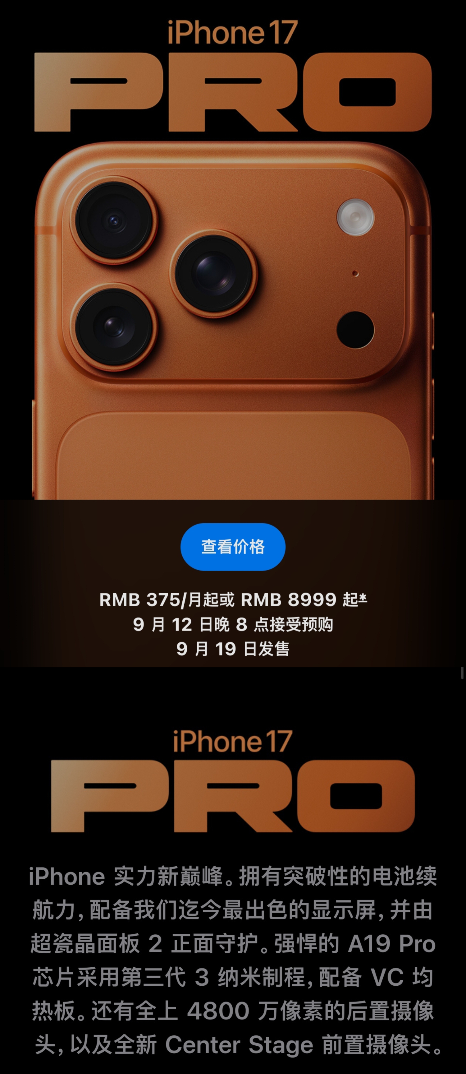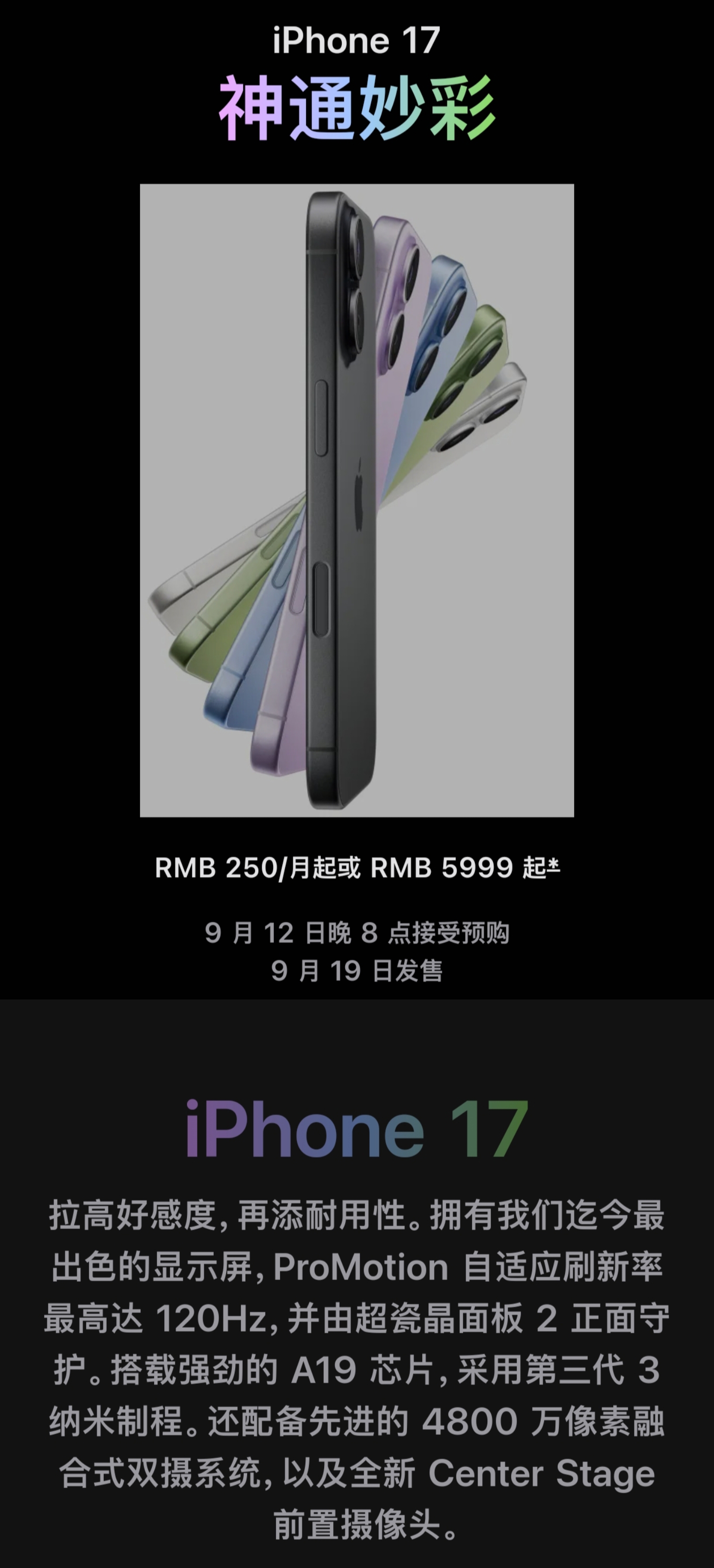 iPhone 17 系列这次堪称“三刀齐发”:Air 带来极致轻薄与续航,基础款换装 120Hz + 更强拍照,Pro 则在性能、散热、拍摄与视频创作上拉满。这次你最种草哪一款?评论区见~ **iPhone 17标准版** 刷新屏幕规格:6.3″ Super Retina XDR 屏,支持 120Hz ProMotion,亮度高达 3 000 尼特 搭载 A19 芯片 + N1 网络芯片(Wi-Fi 7 / 蓝牙 6 / Thread),性能与连接能力拉满 前后摄像升级:后置双 48MP Fusion(广角 + 超广角),前置 18MP Center Stage 摆脱横屏自拍困扰 起始存储提升至 256GB **iPhone 17 Air** 史上最薄,仅 5.6 mm,轻盈如无物,却依旧配备了 A19 Pro 性能,颠覆轻薄机定义 拥有 6.5″ ProMotion 屏幕、3000 尼特峰值亮度,陶瓷盾前盖、钛金属边框加持,既轻薄又坚固 配备 48MP Fusion 主摄 + 12MP 远摄 + 18MP Center Stage 自拍,可前后同时录制,游戏级续航表现(27 小时视频播放,搭配 MagSafe 电池达 40 小时) **iPhone 17 Pro** 全新热锻铝一体成型机身 + 激光焊接蒸汽室散热系统,续航重大飞跃,跑分持续性提升达 40% 三颗 48MP Fusion 后摄(主、超广、远摄),支持至 8× 光学变焦(200mm),堪称口袋中的 8 镜头 18MP 方形 Center Stage 前摄,自拍水平再升级,可横竖皆优 全新专业视频功能:支持 ProRes RAW、Log 2、Genlock 多机同步录制,摄影师和创作者福利 Ceramic Shield 2 前盖(3× 抗刮),背部同样覆盖 Ceramic Shield,耐用性更胜以往 #苹果发布会# #iPhone17# #苹果的牙膏挤爆了# #终于256G起步#