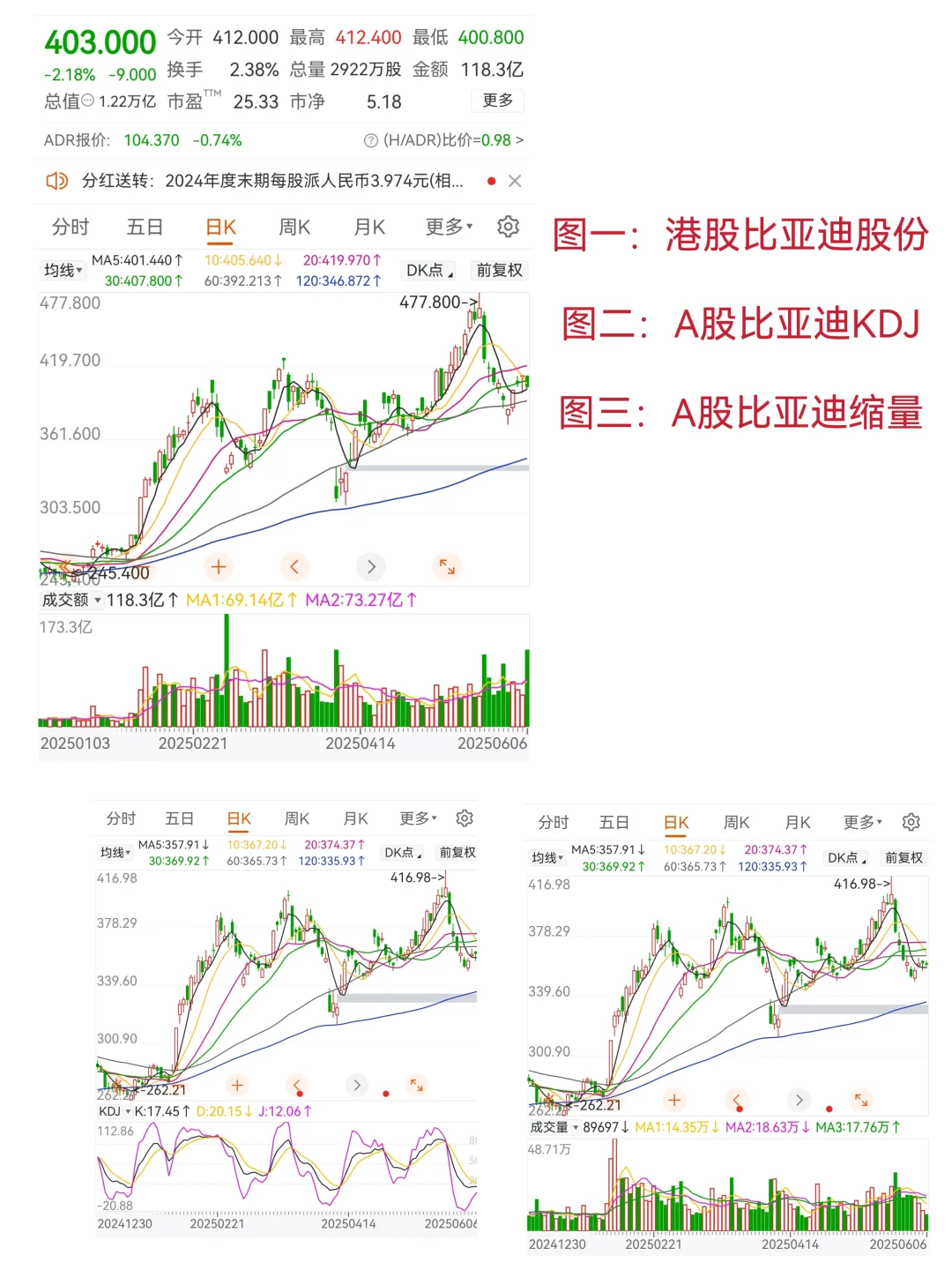 [一R]先看看被调入的比亚迪(详见图三),港股比亚迪股份从高点调整已近20%,A股比亚迪近期也遭遇重挫,A+H都处于低位。技术指标看,A股比亚迪KDJ即将金叉,近期持续下跌的调整逐日缩量,短线连续三日站上五日均线,技术指标已经企稳。