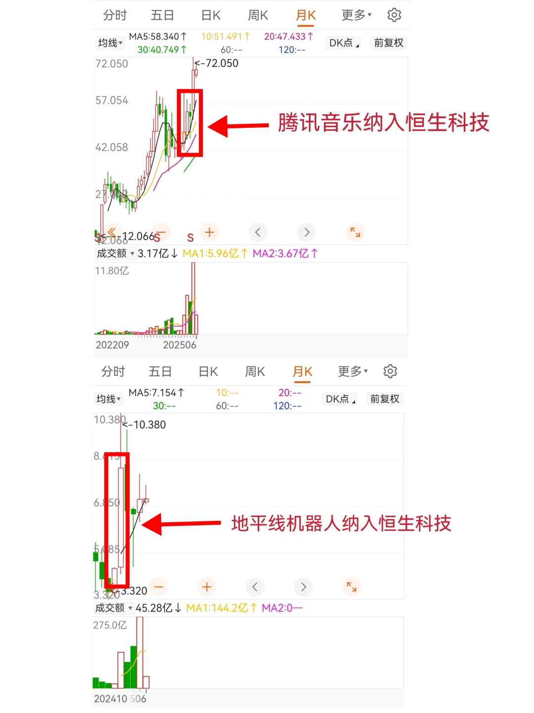 [三R]回溯一下恒生科技指数调整调入的股票表现,近期调入的案例应该能体现当下市场状态。今年2月24日,恒生科技指数纳入腾讯音乐、地平线机器人,纳入当月两只股票均出现较大涨幅(详见图四)