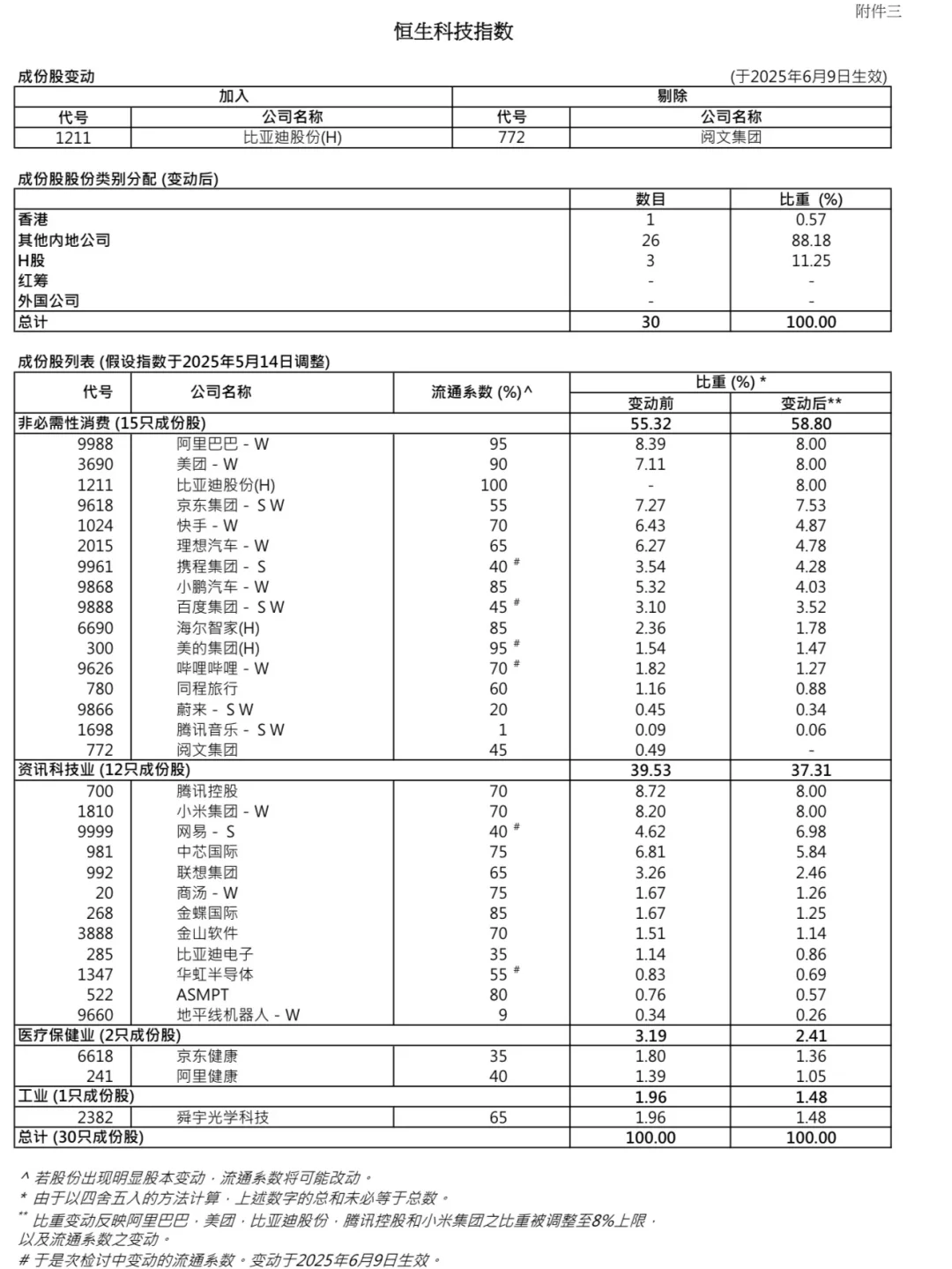 恒生科技指数本周五(6月6日)收市后进行调整,恒生科技指数调入比亚迪股份,剔除阅文集团,将于周一(6月9号生效),成分股数量维持30只(详见图二)。