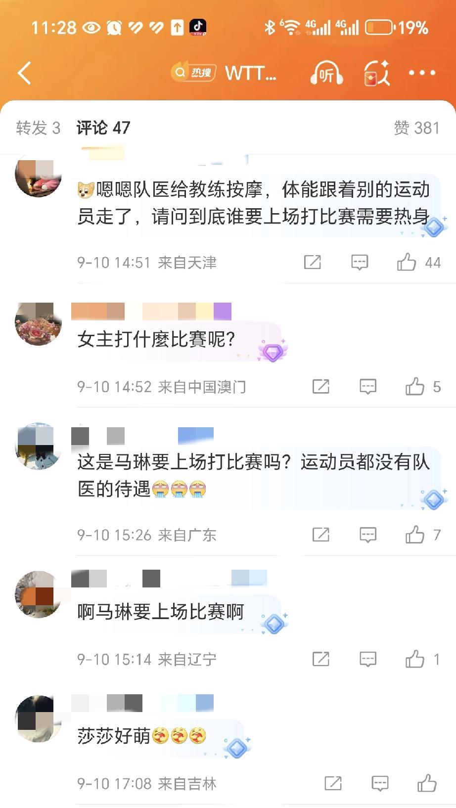 09月10日,马琳坐在地上,队医帮他按摩时,露出痛苦的表情,看来他的伤势还没有完全好,真是难为马琳教练了,还要带伤带队员出征比赛 马琳和孙颖莎坐在地上,孙颖莎做着训练前的热身,马琳被队医享受着五星级的服务,看着队医用力压时,马琳痛得像要生孩子的表情一样,痛苦难受,咬牙坚持着,隔着屏幕让人心疼 有粉丝看见马琳在训练场上按摩,调侃马琳是不是要上场打比赛,有粉丝认为孙颖莎在热身,为什么要现在按摩呢?还有粉丝认为,教练员是长辈和同伴,偶尔按摩下不应该指责,大家会支持谁呢?